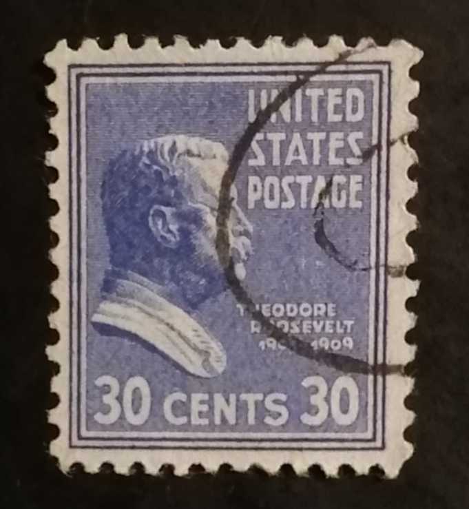 Görseldeki bu son parça, Amerika Birleşik Devletleri Posta Servisi tarafından 1938 yılında basılan ünlü **"Başkanlık Serisi"**ne (Presidential Issue) ait 30 Cent'lik Theodore Roosevelt puludur.