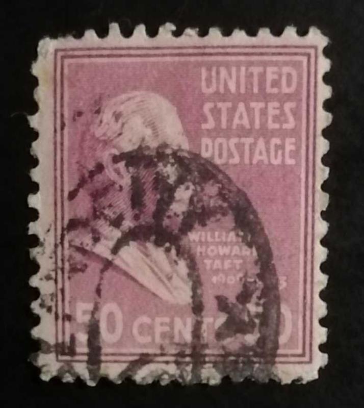 Görseldeki pul, Amerika Birleşik Devletleri tarafından 1938 yılında basılan ünlü **"Başkanlık Serisi"**ne (Presidential Issue) ait 50 Cent'lik William Howard Taft puludur. Bu parça, paylaştığınız serinin en yüksek nominal değerli pullarından biri olmasıyla dikkat çekmektedir. Piyasa Değeri: Kullanılmış ve mühürlü durumdaki bu pulun değeri kondisyonuna göre $1.00 - $3.00 (yaklaşık 45 - 130 TL) arasındadır.