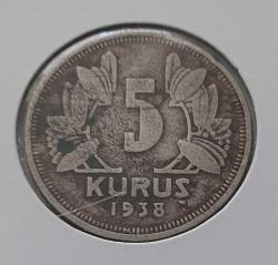 1938 YILI ORİJİNAL 5 KURUŞ MADENİ NİKEL 2Ş3ZZ NADİR