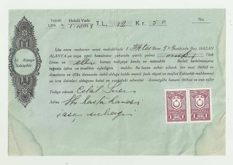 1939 H.ALANYA ESKİŞEHİR SENET...