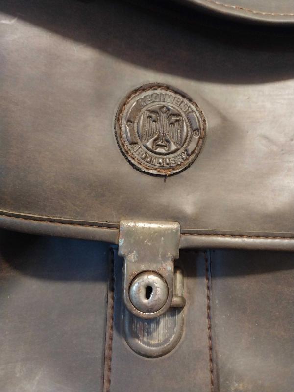 1940 lı yıllardan Alman Topçu Alayı Evrak Çantası.. İkinci Dünya Savaşı dönemine ait Alman askeri teçhizatından nadir bir parça, üzerindeki kabartma Alman Kartalıdır. Tasarım: Ortasında, "Regiment" (Alay) ve "Artillery" (Topçu) kelimeleriyle çevrelenmiş, stlize edilmiş bir kartal figürü (Wehrmacht kartalı) bulunmaktadır. Çanta Suni deriye benzer bir üründür..