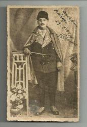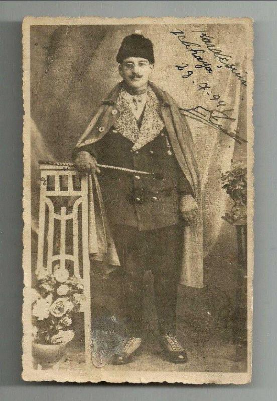 ** KALPAKLI İLGİNÇ KIYAFETLİ ADAM FOTOĞRAFI ** 14 x 9 cm.ebadında,arkası yazısız,ön yüzünde "kardeşim Zeliha!ya" ibaresi bulunan, 1941 tarihinde önü yazılmış ve imzalanmış,ilginç kıyafetli kalpaklı adam fotoğrafıdır...