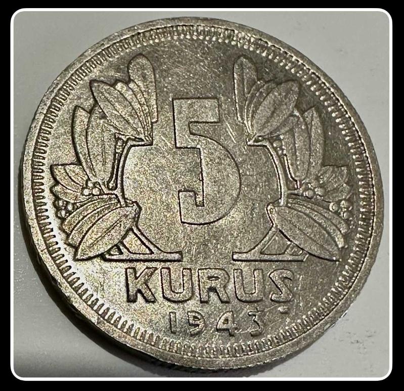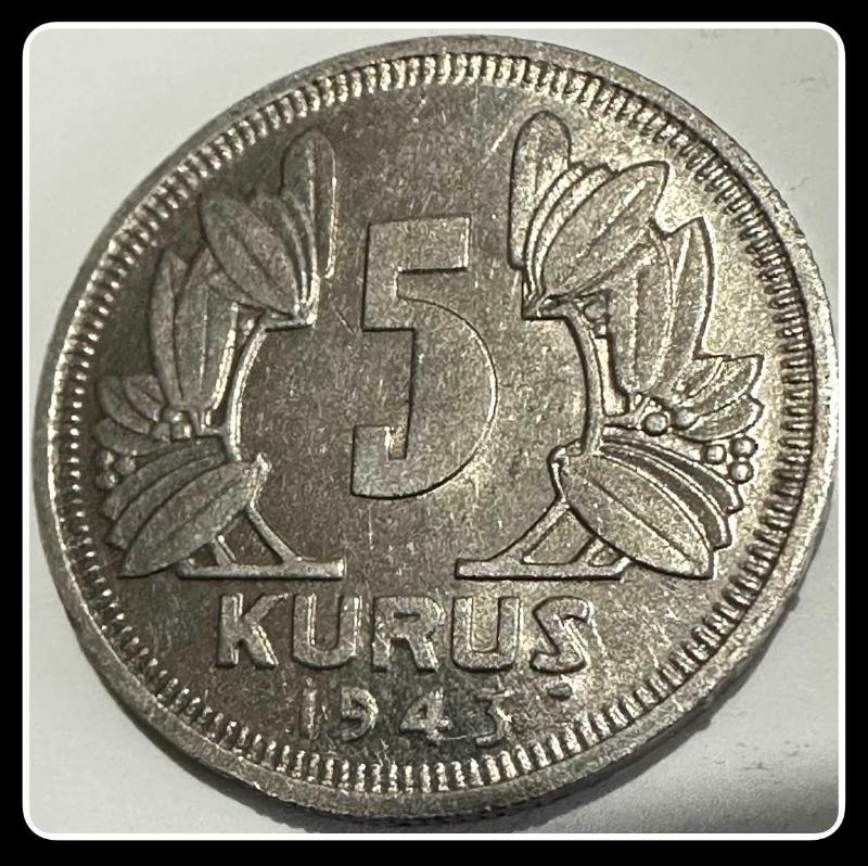1943 - 5 KURUŞ (TCM-43) KM#862 KENAR YUVARLAK 5 Kuruş’lar 1935-1936-1937-1938-1939-1940-1942-1943 tarihlerinde olmak üzere 8 defa basılmıştır. 1935-1952 arası tedavül etmiş olup, en nadir olanı 1935 darp olandır. Bilinen baskı adeti 100 Bin adet kadardır. Koleksiyonumdan çıkma (2.El) üründür. Nümismania Yıldırım Koleksiyon Garantisi ile İADESİ VARDIR