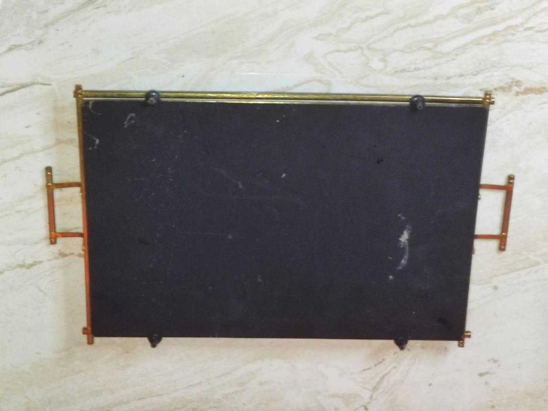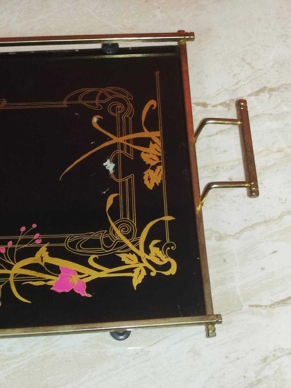 19470-1980 YILLARIN ÇOK KULLANILAN NOSTALJİK METAL ÇERÇEVELİ BOYAMA ÇİÇEK DESENLİ CAM KAHVE TEPSİSİ CAÇ ÜZERİNDEKİ BOYAMA DESENİNİN BAZI YERLERİNDE SOYULMA VARDIR