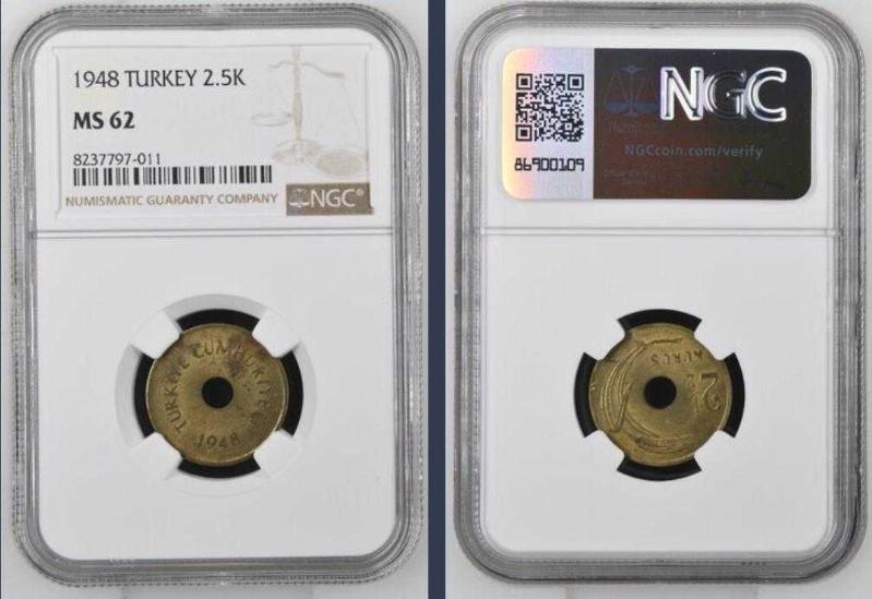 1948 2.5 kuruş (delikli) - çil - NGC MS 62 sertifikalı, 19 gün önce satışa sunulmuştur.