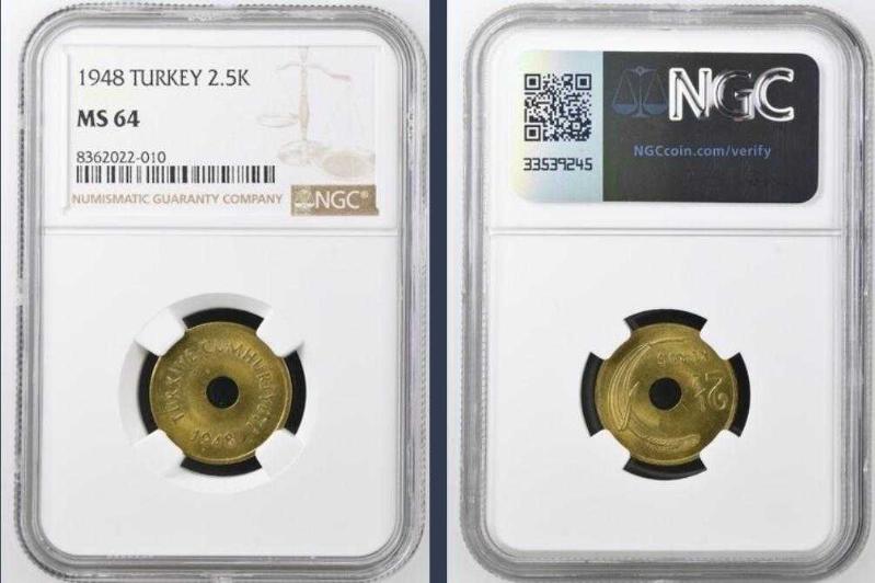 1948 2.5 kuruş (delikli) -çil- NGC MS 64 sertifikalı, 19 gün önce satışa sunulmuştur.