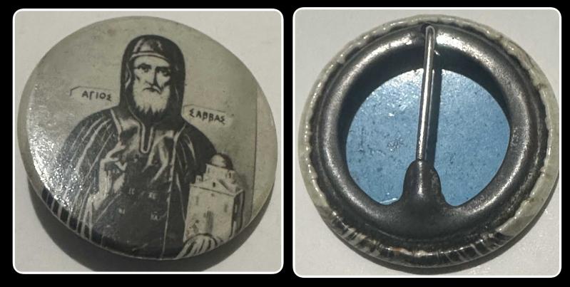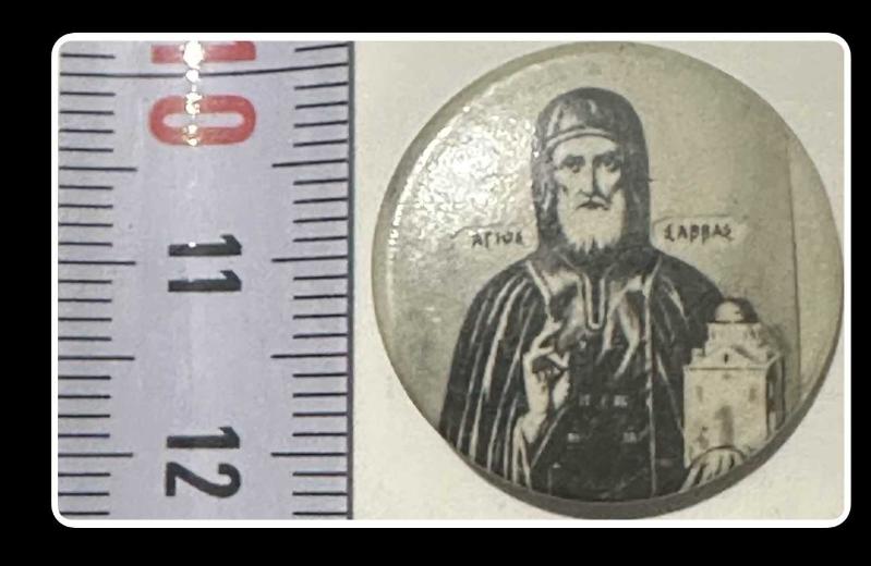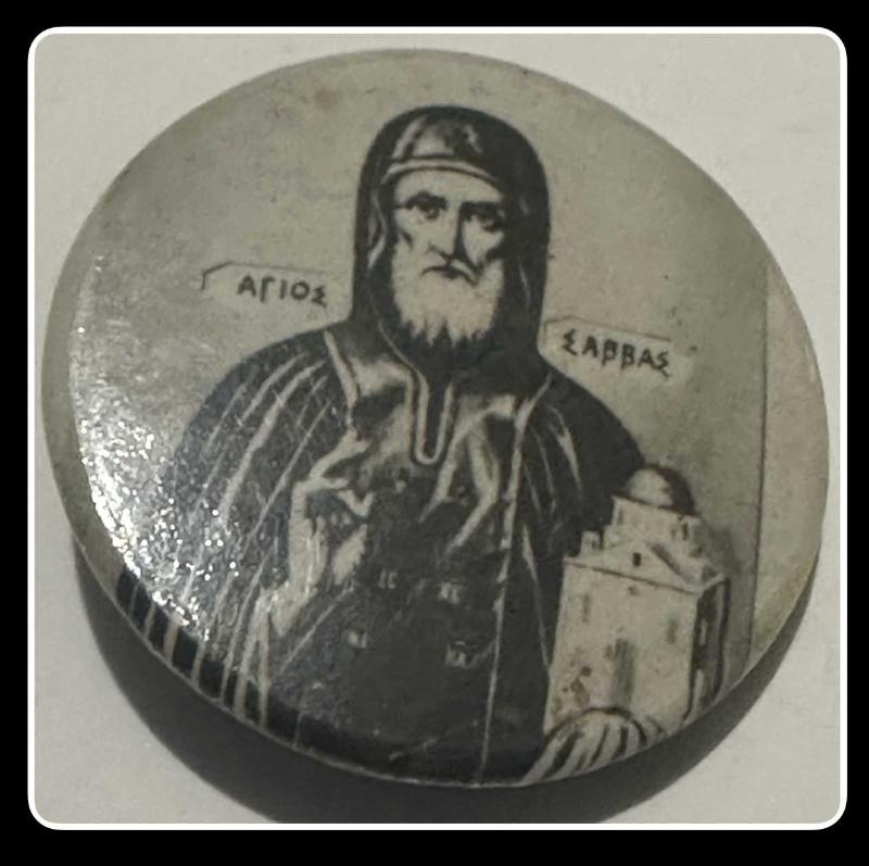 (Agios) Aziz (Sabbas / Savvas) : Aziz Sabbas Filistin – Kudüs çevresinde bulunan, Mar Saba Manastırı’nın kurucusu ve Doğu Ortodoks dünyasında çok önemli bir Aziz Sabbas’ın Ziyaretini (HAC) Anısına 1950-1960 yıllarında bastırılıp, kullanılan ORJİNAL ROZET’tir. Özellikle, Yunanistan, Kudüs veya Ortadoğu Ortodoks merkezlerinde Hacılar için üretilen rozet.