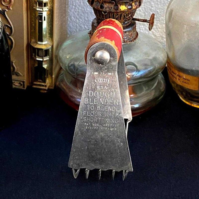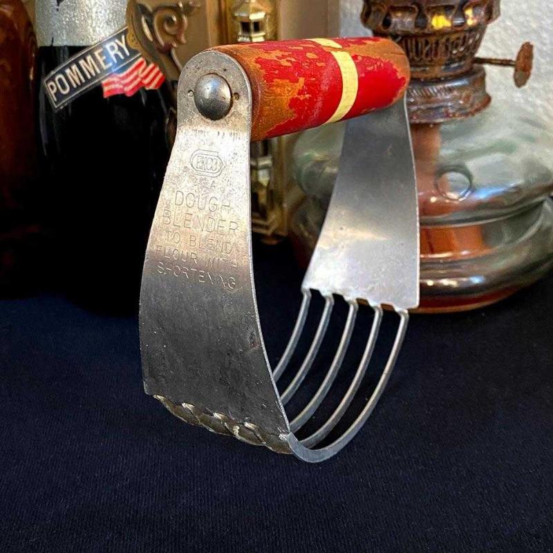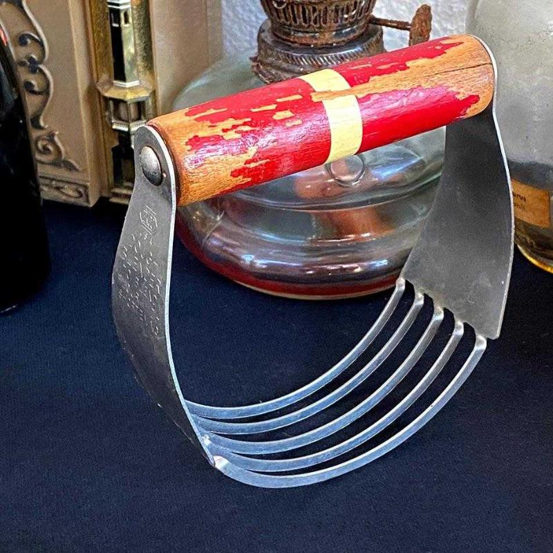 Amerikan EKCO firmasının 1950'lerden kalma, kırmızı ahşap saplı, çelik hamur karıştırma aleti. Aletin her iki tarafındaki metal yüzeyinde "ECO USA" damgası ve "Unu katı yağ ile karıştırmak için kullanılan hamur karıştırıcısı" ve aletin patent numarası yazıyor. Nostaljik mutfak aletleri severler için harika bir dekorluk eşya olan alet yaşına göre iyi durumdadır. Ahşap sapında hafif bir çatlak ve biraz boya dökülmesi dışında herhangi bir sorunu yoktur. 12x11 cm 100 gr