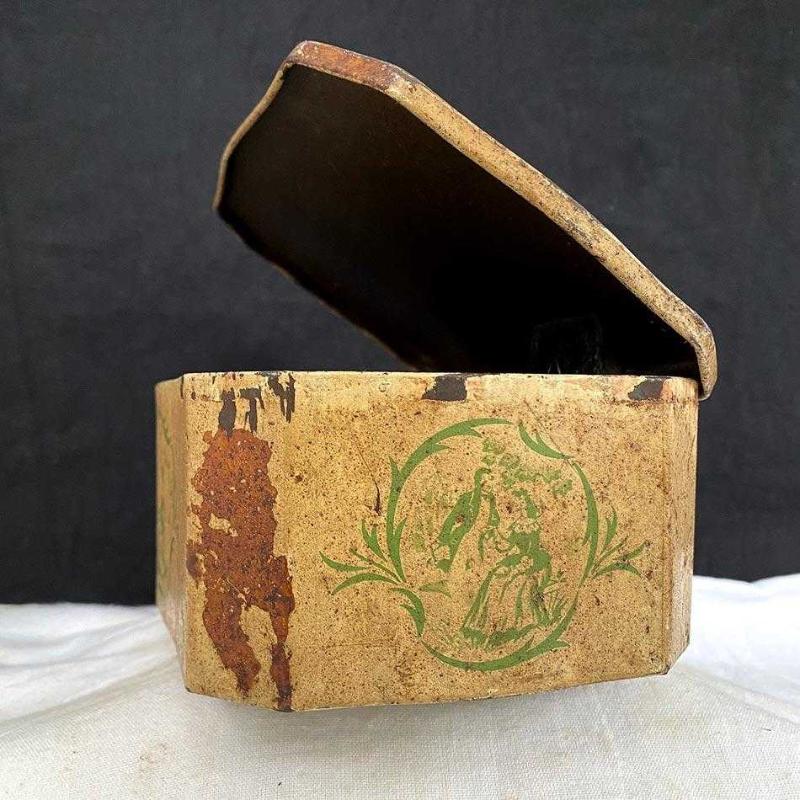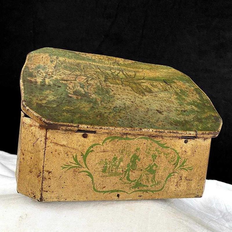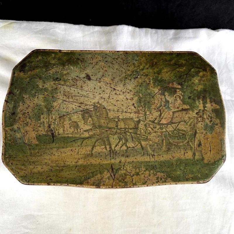 1950'lerdan kalma İngiliz üretimi, kabara ayaklı teneke bisküvi kutusu Viktoryen dönemin zarafetini 1950'lerin endüstriyel üretimiyle buluşturan kutu, tabanında dört adet yarım küre şeklinde kabara ayak (ball feet) ve kavisli formuyla döneminin üst segment ambalaj tasarımlarından biridir. Kutunun üzerinde, Viktoryen dönem kıyafetleri içinde atlı arabayla seyahat eden figürler, yanlarda hardal sarısı zemin üzerine koyu yeşil "monochrome" (tek renk) figürler ve pastoral bir doğa manzarası yer alıyor. Kutu yaşına göre iyi durumdadır. Üzerindeki orijinal baskı resimler biraz solmuş ve aşınmış durumda. Kutunun içi, zamanın getirdiği doğal bir oksidasyon ve koyu gri patinaya sahip. Herhangi bir kırık, çatlak vs yoktur. Orijinal menteşesi ve kapağı iyi durumdadır. Doğal patinasını etkilemeyecek şekilde metal temizliği ve bakımı yapılmıştır. Zarif metal kutu, Farmhouse/rustik dekorasyonlarda, raf üzerinde imza bir parça veya şık bir muhafaza kutusu olarak idealdir. 7x20x14 cm 250 gr