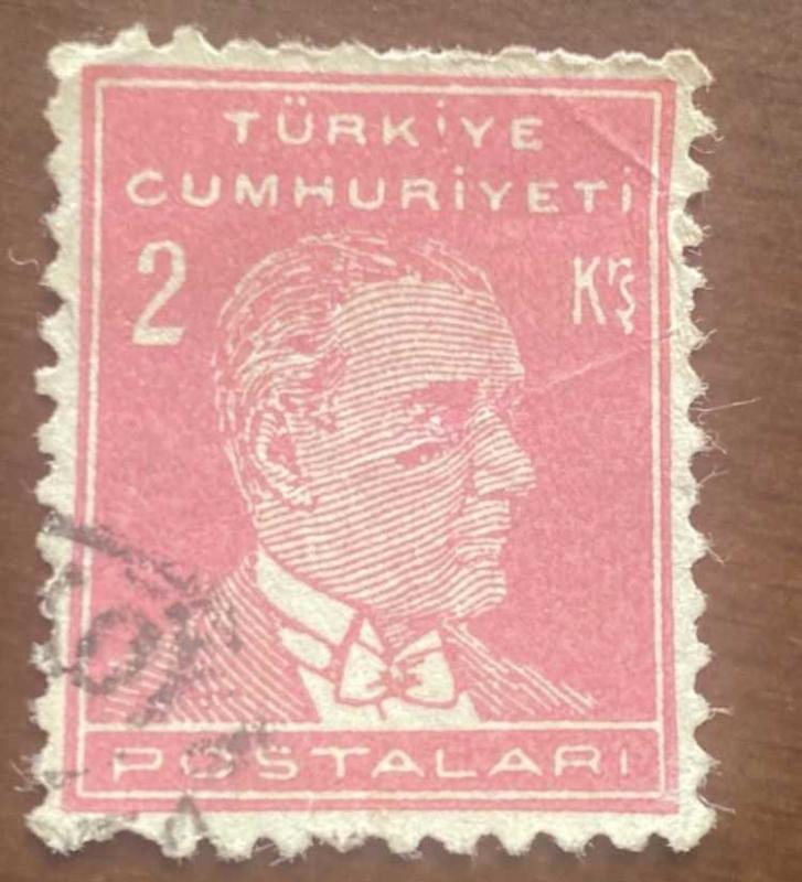 Türkiye Cumhuriyeti kurucusu Mustafa Kemal Atatürk'ün portresinin bulunduğu 2 Kuruş değerinde pembe renkli bir Türk posta pulu KONDÜSYONU FOTOĞRAFTA GÖRÜLDÜĞÜ GİBİDİR.