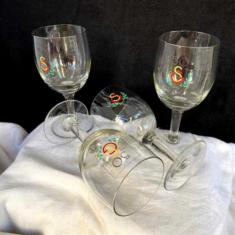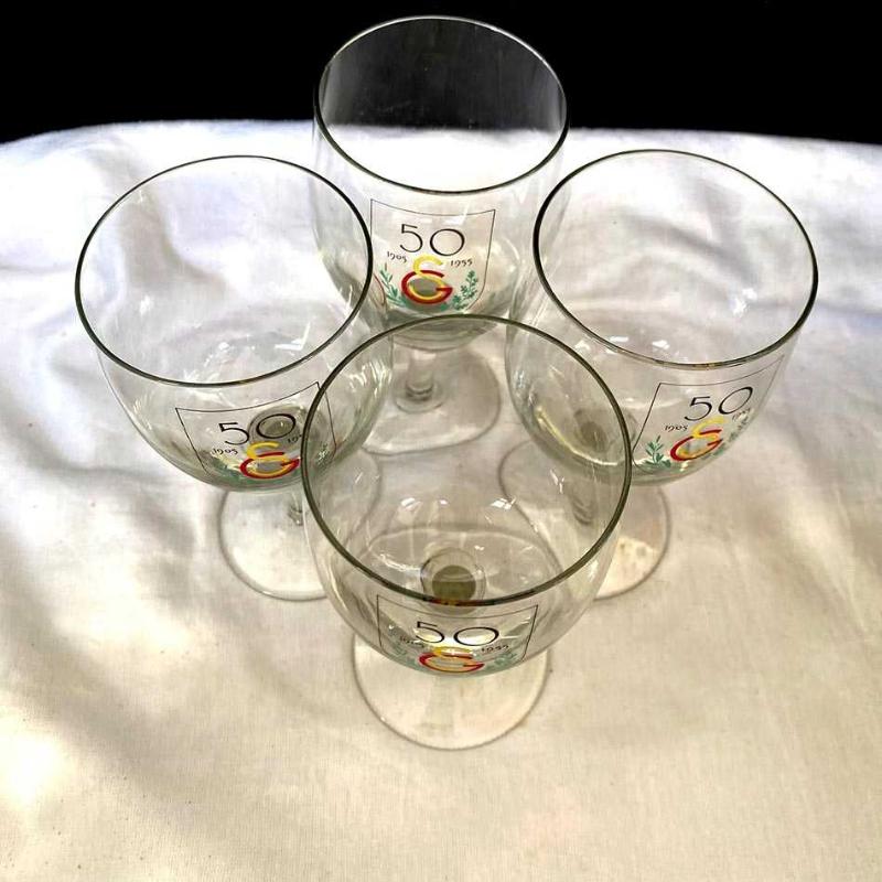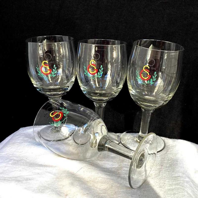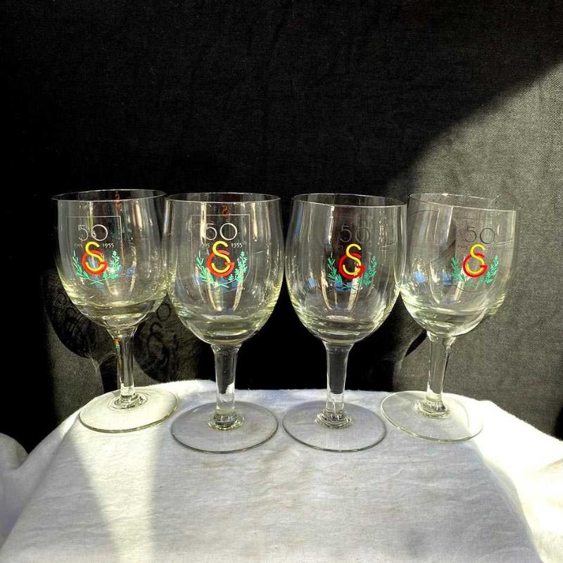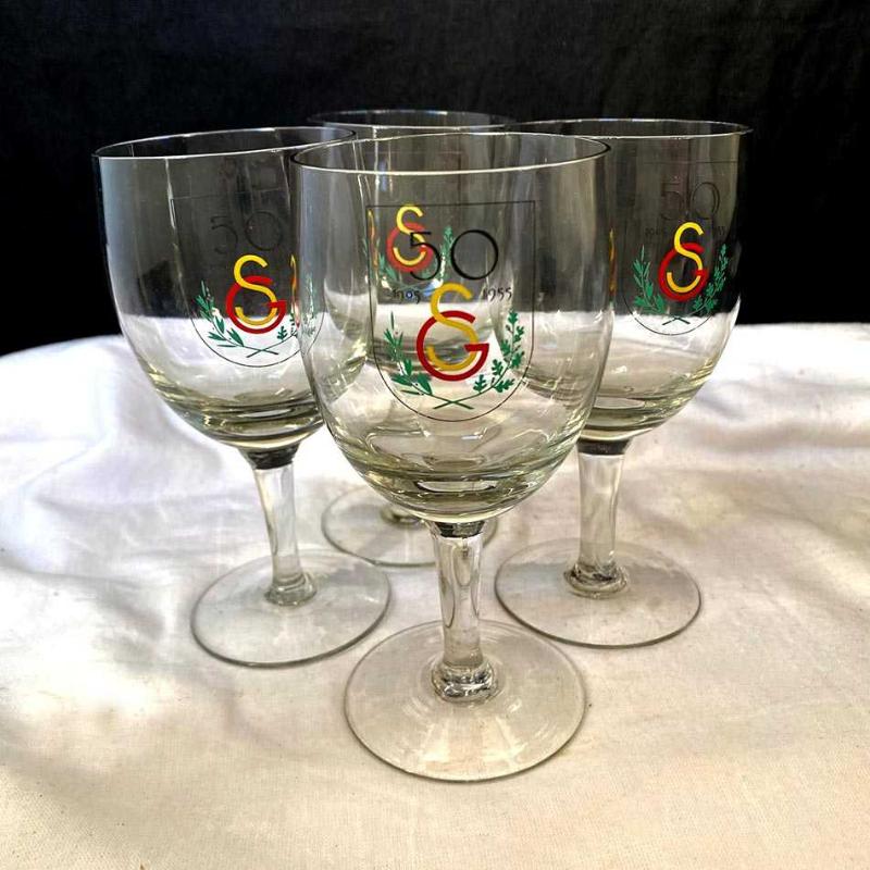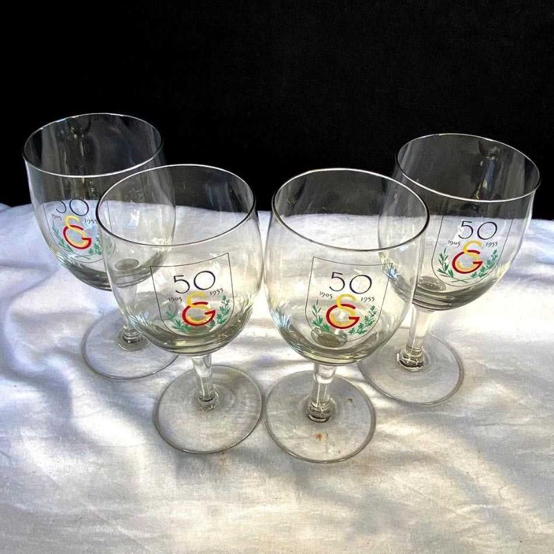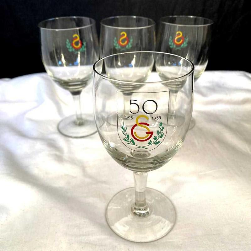4 adet cam kadehten oluşan set, Galatasaray Spor Kulübü’nün 1905-1955 arası yarım asırlık yolculuğunu kutlamak adına sınırlı sayıda üretilmiş. Cam kadehlerin üzerinde GS logosu ve logonun iki yanında defne ve meşe yaprak çelengi yer alıyor. Defne başarıyı ve zaferi, meşe köklü geçmişi simgeliyor. Logonun üst tarafında ise bir tarafta kulübün kuruluş yılı 1905, diğer tarafta 1955 tarihi yer alıyor. Logonun üzerinde 50 rakamı yazılı. Kadehler yaşına göre iyi durumdadır ve iyi muhafaza edilmiş. Herhangi bir çatlak vs yoktur. Kadehlerin üzerindeki renkli logo baskıları temiz ve canlıdır. Boy: 15 cm Alt-Üst Çap: 7 cm Tek: 170 gr