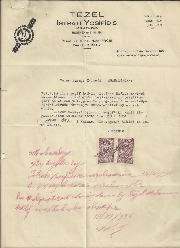 ** 1956 TEZEL İSTRATİ YOSİFİDİS MÜHENDİS İMZALI TEKNİK YAZIŞMA VE ZARFI ** A4 ebadında antetli kağıtta ıslak imzalı teknik bir yazışmadır... Zarfıyla birliktedir..
