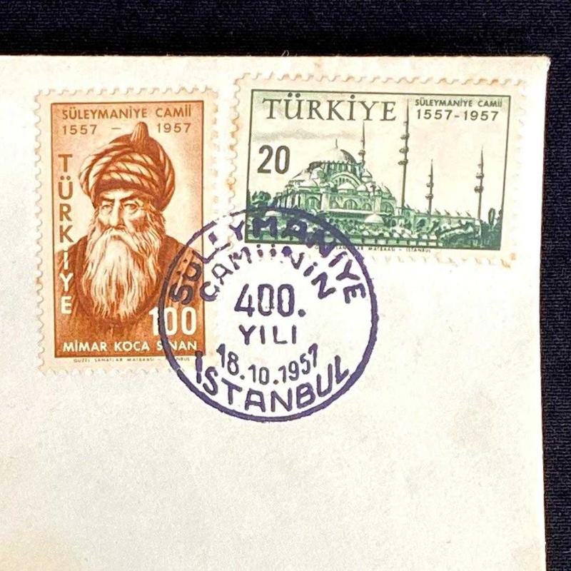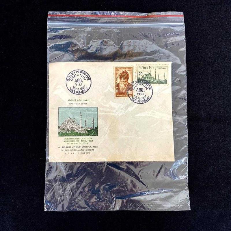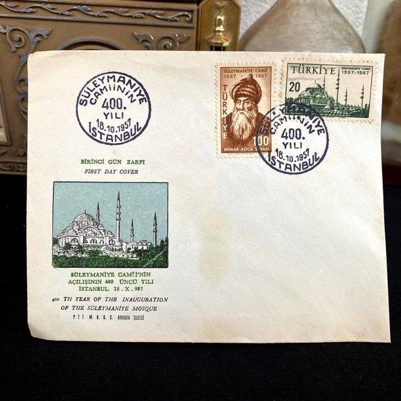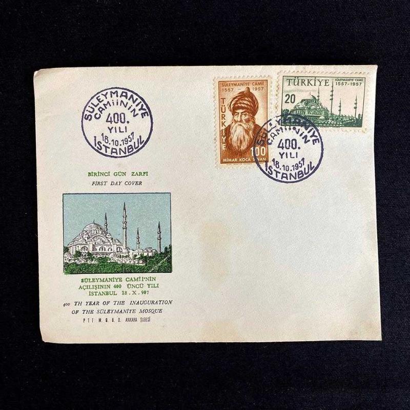 Süleymaniye camisinin 1957 yılından kalma, 400. yılı anısına özel olarak bastırılmış birinci gün zarfı ve pulları. Koleksiyonerler için nadir bulunur bir parça olan zarf ve pullar, Osmanlı mimarisinin zirve örneklerinden Süleymaniye caminin 400. yıl hatırasına basılmış. Zarfın sol üst köşesinde "Süleymaniye Camiinin 400 Yılı, 18.10.1957 İSTANBUL" yazıyor. Altında "BİRİNCİ GÜN ZARFI - FIRST DAY COVER" yazılı. Onun altında caminin ilüstrasyon boyama resmi basılmış. Resmin altında "Süleymaniye Caminin Açılışının 400 üncü Yılı İSTANBUL 18.X.957 - 400 TH YEAR OF INAUGURATION OF THE SULEYMANIYE MOSQUE, PTT M.O.B.D ANKARA SUBESI" yazılı. Zarfın sağ üst köşesinde 2 adet pul ve damga yer alıyor. Pullardan biri, 100 paralık dikey "MİMAR KOCA SİNAN" pulu, diğeri ise 20 paralık yatay Süleymaniye Cami pulu. Pullardan her ikisi de Güzel Sanatlar Matbaası - İSTANBUL basımı. Zarf ve üzerindeki pullar yaşına göre iyi durumdadır, ışık görmeyecek şekilde ve hava geçirmez plastik torbada özenle muhafaz edilmiştir. 12x15 cm