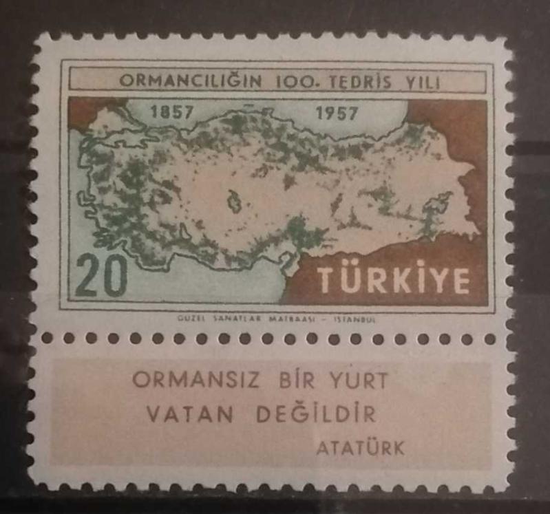Bu pul, 1957 yılında "Ormancılığın 100. Tedris Yılı" (1857-1957) anısına Türkiye Cumhuriyeti Posta İşletmesi tarafından basılan serinin 20 kuruşluk değeridir. Tekli Değer (Tablı): Fotoğraftaki gibi "tablı" ve temiz (damgasız/MNH) durumdaki bir pulun piyasa değeri yaklaşık 25 TL ile 50 TL arasındadır.