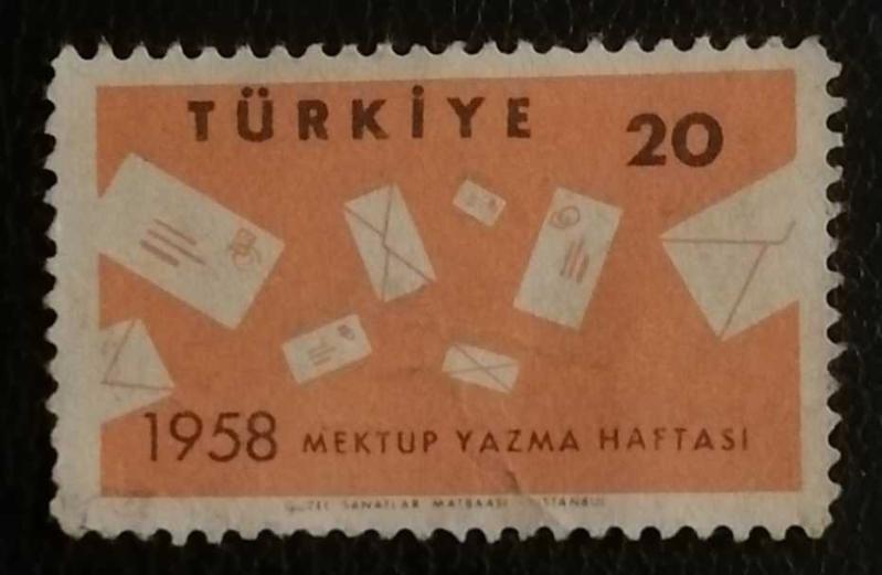 Bu pul, 1958 yılı "Mektup Yazma Haftası" anısına basılmıştır. Damgasız ve temiz bir örneği piyasada yaklaşık 25,00 TL - 45,00 TL bandında değerlendirilmektedir.
