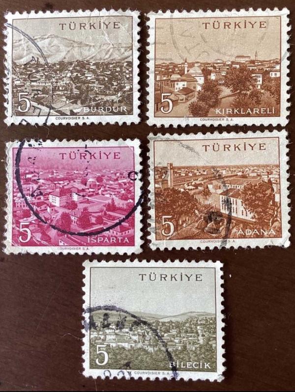 BEŞİ BİRDEN. 1958 TÜRKİYE’DEN MANZARALAR. Farklı şehir manzaralarını gösteren çok renkli, eski Türkiye posta pullarından oluşan koleksiyon. Burdur, Kırklareli, Isparta, Adana,Bilecik gibi şehirler yer alıyor. ️ KONDÜSYONLARI RESİMLERDE GÖRÜLDÜĞÜ GİBİDİR. KONDÜSYONLARI RESİMLERDE GÖRÜLDÜĞÜ GİBİDİR