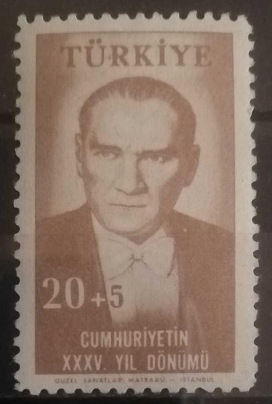 Bu pul, 1958 yılında "Cumhuriyet'in 35. Yıl Dönümü" (XXXV. Yıl Dönümü) anısına basılan 3 pulluk anma serisinin bir parçasıdır. Tekli Değer:genellikle 15 TL ile 25 TL arasında bir perakende satış fiyatı bulur.