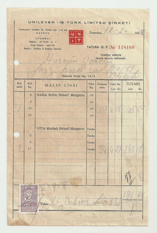 1958 ÜNİLEVER-İŞ TÜRK LİMİTED ŞİRKETİ 118160 NUMARALI SANA / VİTA FATURASI...