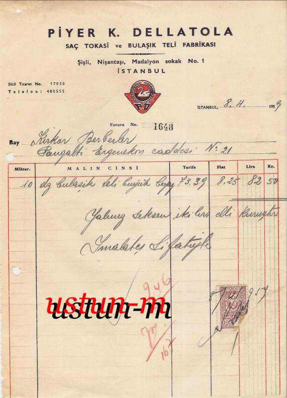 ** PİYER K.DELLATOLA SAÇ TOKASI VE BULAŞIK TELİ FABRİKASI ** 8 Haziran 1959 tarihli,çok temiz durumda,tek damga pullu, büyük beyaz bulaşık teli temalı döneminin orijinal faturalarından...
