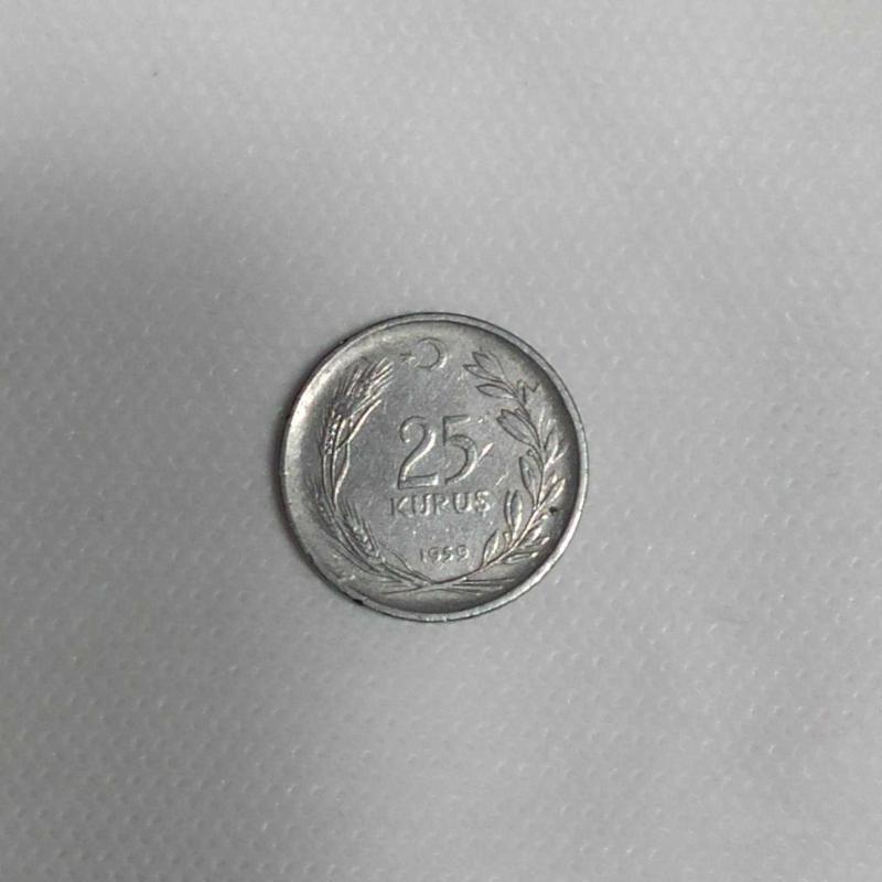 Ülke Türkiye Periyod Türkiye Cumhuriyeti (1934 - 1980) Para Birimi Türk lirası Para tipleri Tedavül madeni paralar Değeri 25 Kuruş Yıl 1959 Kenar süslü yazılı Kenar yazı 'T.C' Şekli Yuvarlak Hizalama Madeni para hizalaması (180°) Malzeme detayları Paslanmaz Çelik Ağırlık (g) 5 Çap (mm) 22,6 Kalınlık (mm) 2,1