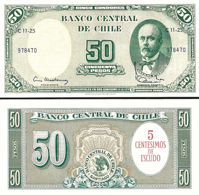 Yabancı Kağıt Para 1960-61 Yılı Şili 5 Centesimos Çil Kondüsyon Şili'nin para birimini Peso'dan Escudo'ya çevirdiği geçiş döneminde (1959-1964) kullanılan, 50 Pesoluk banknot üzerine kırmızı "5 Centesimos de Escudo" damgası basılmış geçici bir banknottur. Ülke ve Birim: Şili, 50 Peso / 5 Centésimos de Escudo. Tarih: Yaklaşık 1960-1961 yılları arasında basılmıştır. Özellikler: Ön yüzde Şili Başkanı Aníbal Pinto'nun portresi bulunur. Durum: Koleksiyon değeri taşıyan numismatik bir parçadır.