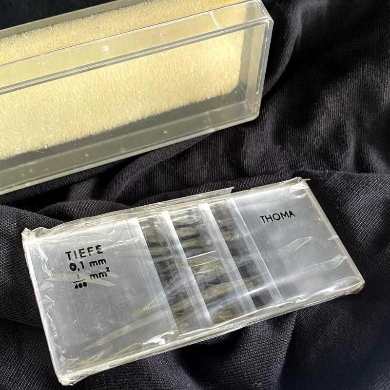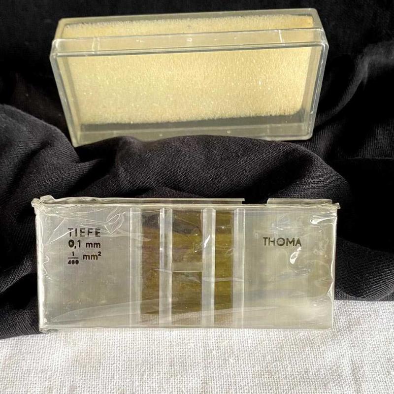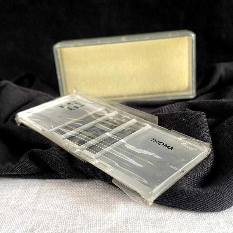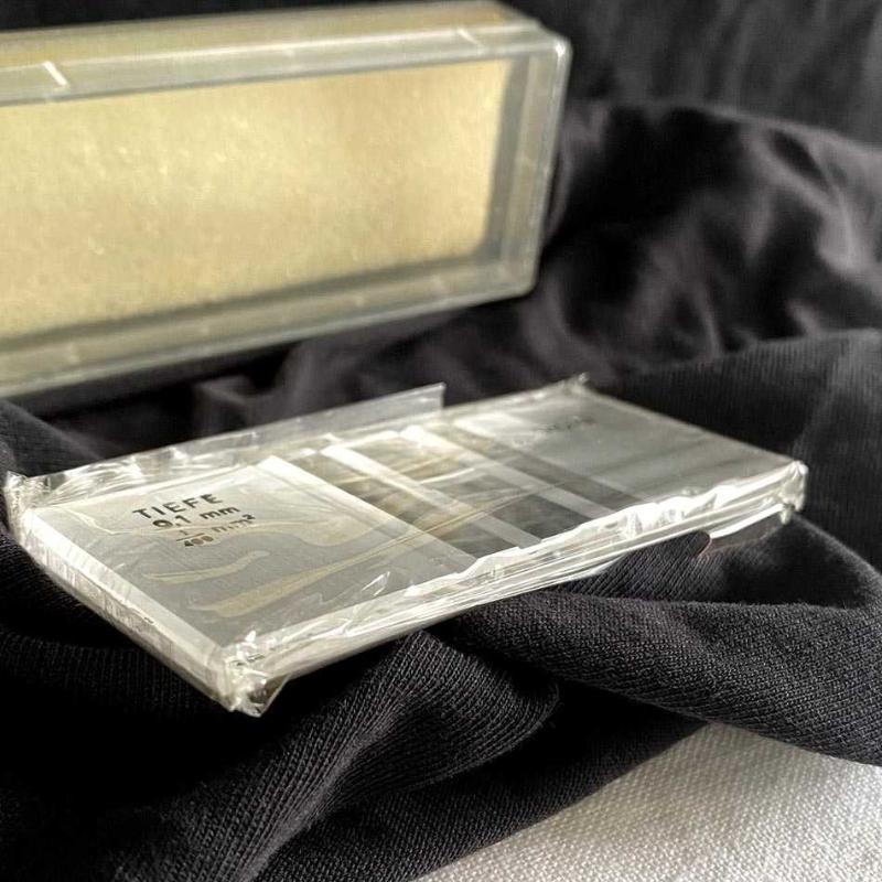 1960’lı yıllarda Almanya’da üretilen bu parça, tıp ve biyoloji laboratuvarlarının en hassas ölçüm araçlarından biridir. Döneminden kalma orijinal koruyucu jelatini içinde, "New Old Stock" (hiç kullanılmamış stok) kondisyonundadır. Üzerinde "TIEFE 0,1 mm" ibaresi yer alan ürün, yüksek kaliteli Alman mühendisliğinin bir örneğidir. Cam gövde üzerine asitle işlenmiş teknik veriler ve ölçüm ızgarası, endüstriyel tasarımın bilimle harmanlandığı estetik bir duruş sergiler. Bu model, metal kıskaç barındırmayan yalın tasarımıyla saflığı ve korunmuşluğu temsil eder. Orijinal kutusu ve koruma süngeriyle birlikte, fabrikadan çıktığı günkü kondisyonunu korumaktadır. Box: 8x3.5 cm 30 gr