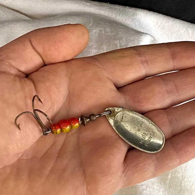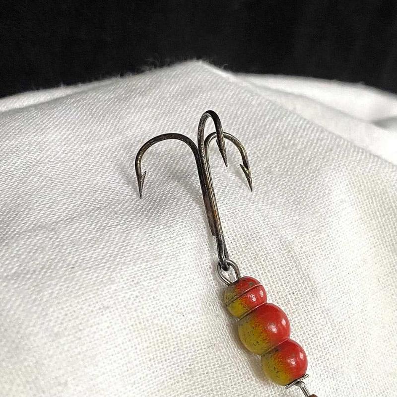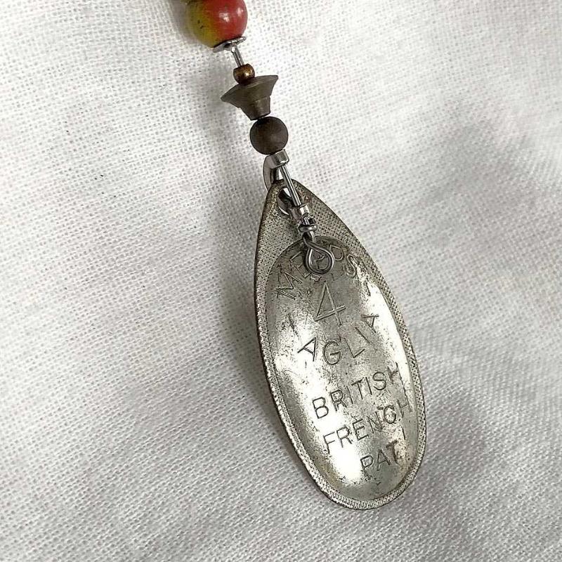 Fransa üretimi olan bu parça, markanın en popüler serisi "Aglia"nın erken dönem örneklerindendir. Gövdesi paslanmaz çelik bir mil üzerine dizilmiş karakteristik kırmızı-sarı renkli boncuklar ve döküm metal bir ağırlıktan oluşur. Alt kısımda yer alan oval formlu döner metal kaşık, su içindeki hareketiyle ışığı yansıtacak şekilde tasarlanmıştır. Metal kaşığın ön yüzünde "MEPPS 4 AGLIA" ve "BRITISH FRENCH PAT" ibareleri, arka yüzünde ise "MADE IN FRANCE" damgası yer almaktadır. Üst kısmında orijinal üçlü (treble) çelik kancası bulunan bu parça, dönemin endüstriyel tasarım dilini ve malzeme kalitesini gösteren bir koleksiyon objesidir. Ürün yaşına göre çok iyi durumdadır. Metal yüzeyinde zamanla oluşmuş hafif ve doğal bir patina mevcuttur. Herhangi bir kırık veya fonksiyonel bozukluk yoktur. 10 cm 10 gr.