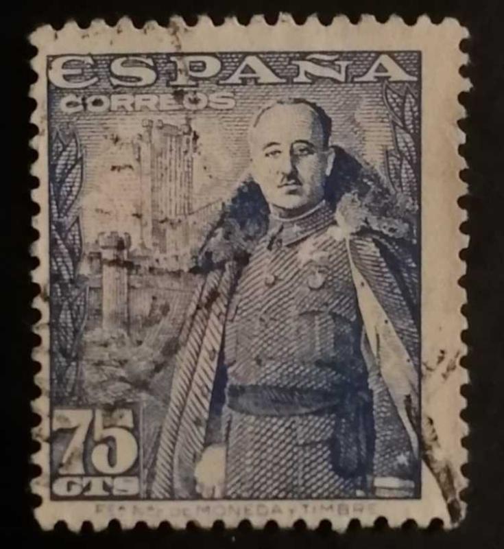 Bu pul, İspanya'yı 1939'dan 1975'e kadar yöneten Francisco Franco'yu (El Caudillo) askeri üniformasıyla tasvir eden klasik bir basımdır.