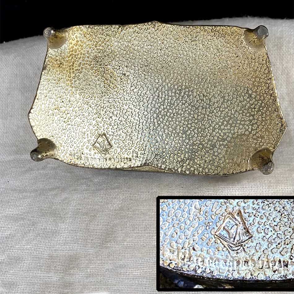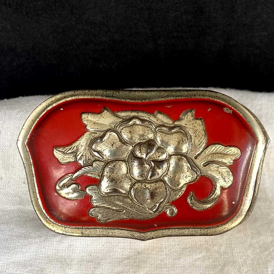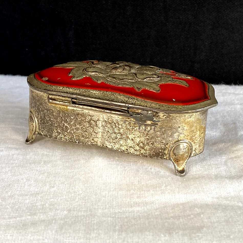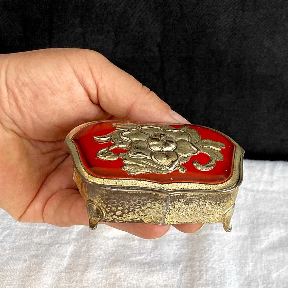Japonya'nın 2. dünya savaşı sonrası dünyaya ihraç ettiği karakteristik mid-century tarzı dekoratif ürünlerden olan kutu, "antimon" adlı kurşun-kalay alaşımından dökülmüş. Yamatogumi firmasının ustalığını yansıtan mücevher kutusunun kapağında canlı kırmızı mine üzerine kabartma olarak işlenmiş gümüş tonlarında gül ve yaprak motifi bulunuyor. Kapağın çerçevesindeki tırtıklı detaylar ve kutunun kavisli hatları, dönemin romantik estetik anlayışını yansıtıyor. Kutunun altındaki baklava dilimi formundaki geometrik "Y" logosu ve "JAPAN" ibaresi üreticinin özgün damgasıdır. İç kısmı, değerli objeleri korumak amacıyla şişkin yastık zemin ve üzeri lacivert kumaş döşemeyle kaplıdır. Dört adet zarif kavisli ayak üzerinde duran kutu, yaşına göre iyi durumdadır. Orijinal menteşesi tamir görmüş ama hala tek parça ve iyi durumda. İç astarı biraz yıpranmış ama hala iyi durumda. Metal yüzeyinde zamanla 9x5x3.5 cm 170 gr