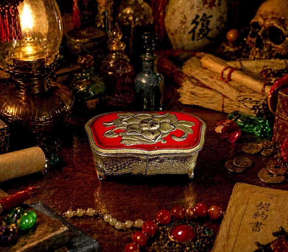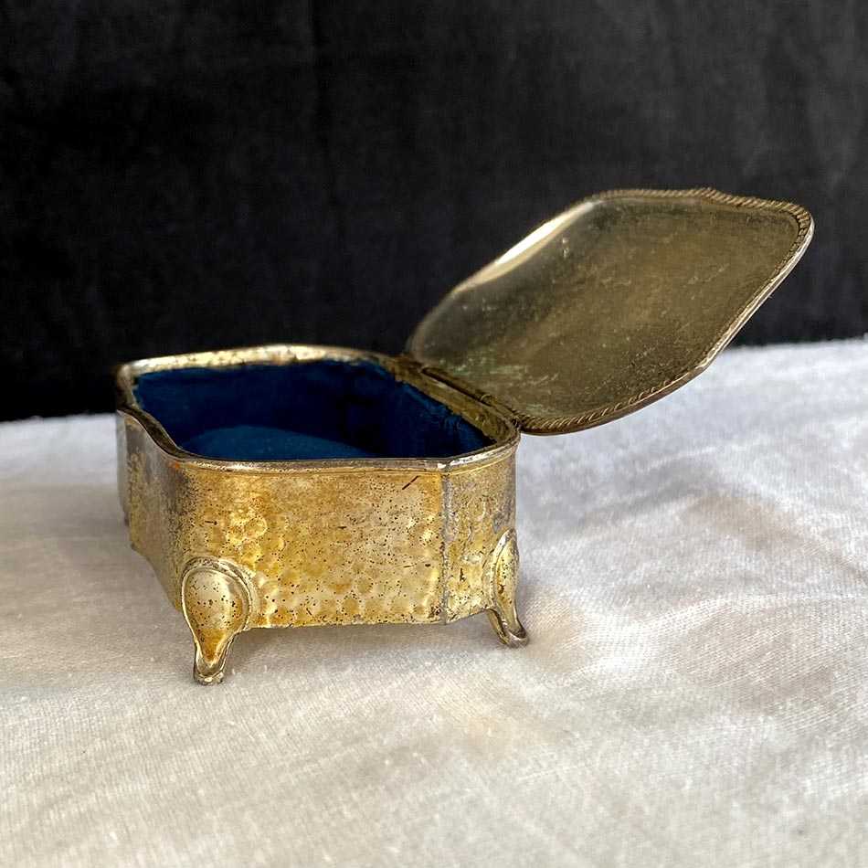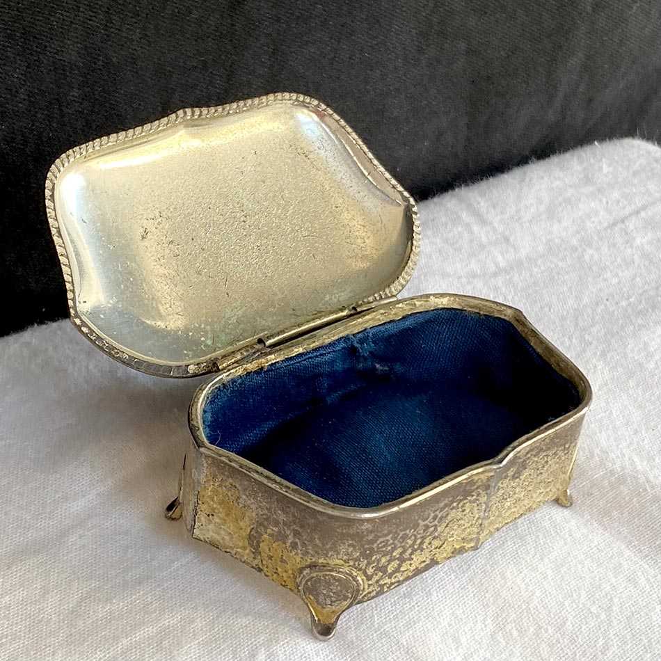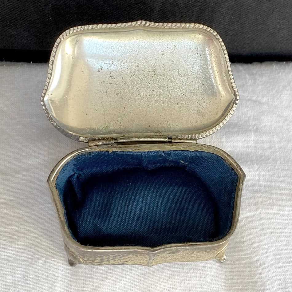 Japonya'nın 2. dünya savaşı sonrası dünyaya ihraç ettiği karakteristik mid-century tarzı dekoratif ürünlerden olan kutu, "antimon" adlı kurşun-kalay alaşımından dökülmüş. Yamatogumi firmasının ustalığını yansıtan mücevher kutusunun kapağında canlı kırmızı mine üzerine kabartma olarak işlenmiş gümüş tonlarında gül ve yaprak motifi bulunuyor. Kapağın çerçevesindeki tırtıklı detaylar ve kutunun kavisli hatları, dönemin romantik estetik anlayışını yansıtıyor. Kutunun altındaki baklava dilimi formundaki geometrik "Y" logosu ve "JAPAN" ibaresi üreticinin özgün damgasıdır. İç kısmı, değerli objeleri korumak amacıyla şişkin yastık zemin ve üzeri lacivert kumaş döşemeyle kaplıdır. Dört adet zarif kavisli ayak üzerinde duran kutu, yaşına göre iyi durumdadır. Orijinal menteşesi tamir görmüş ama hala tek parça ve iyi durumda. İç astarı biraz yıpranmış ama hala iyi durumda. Metal yüzeyinde zamanla 9x5x3.5 cm 170 gr