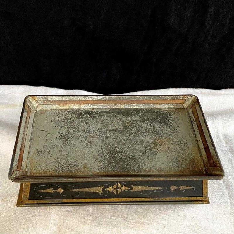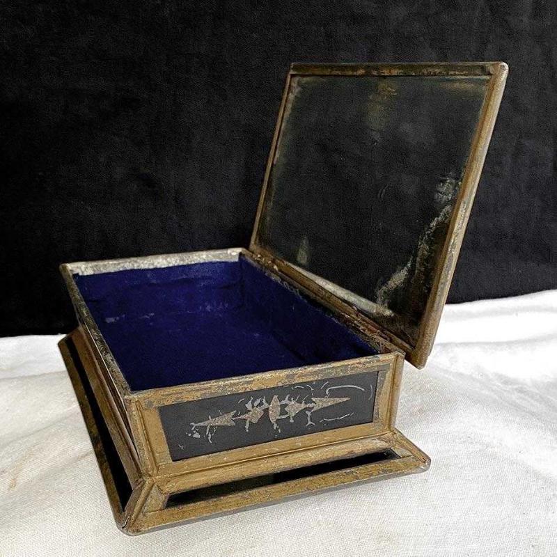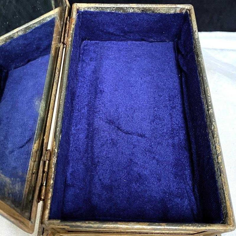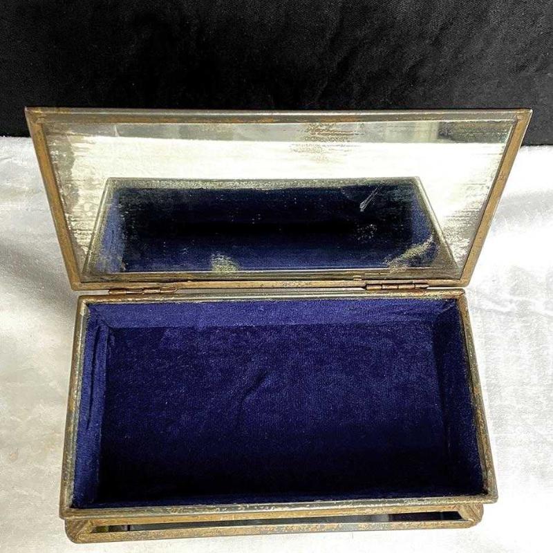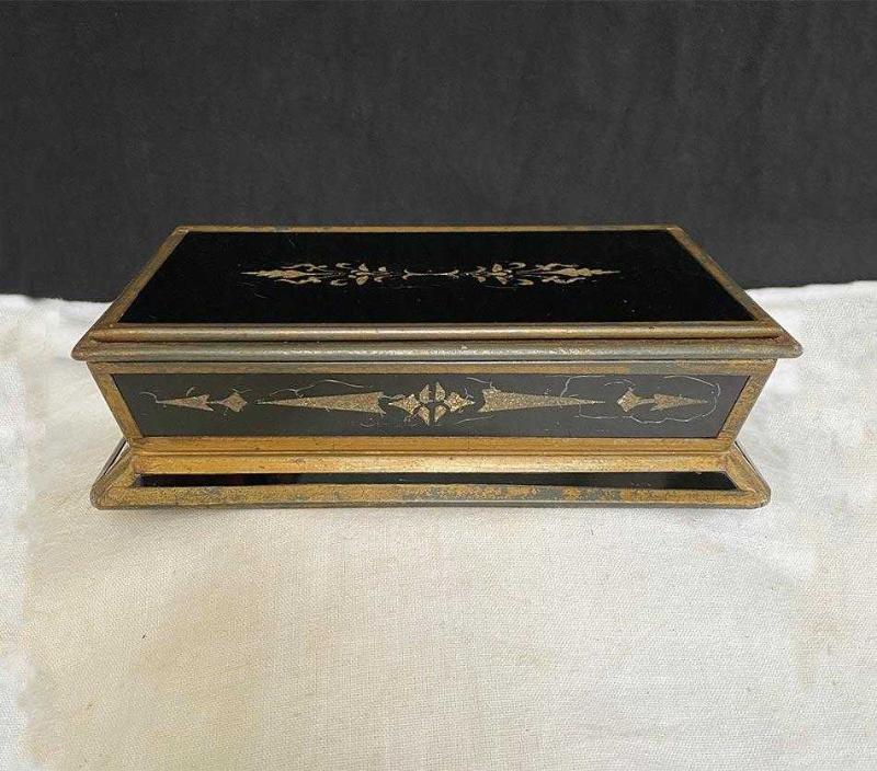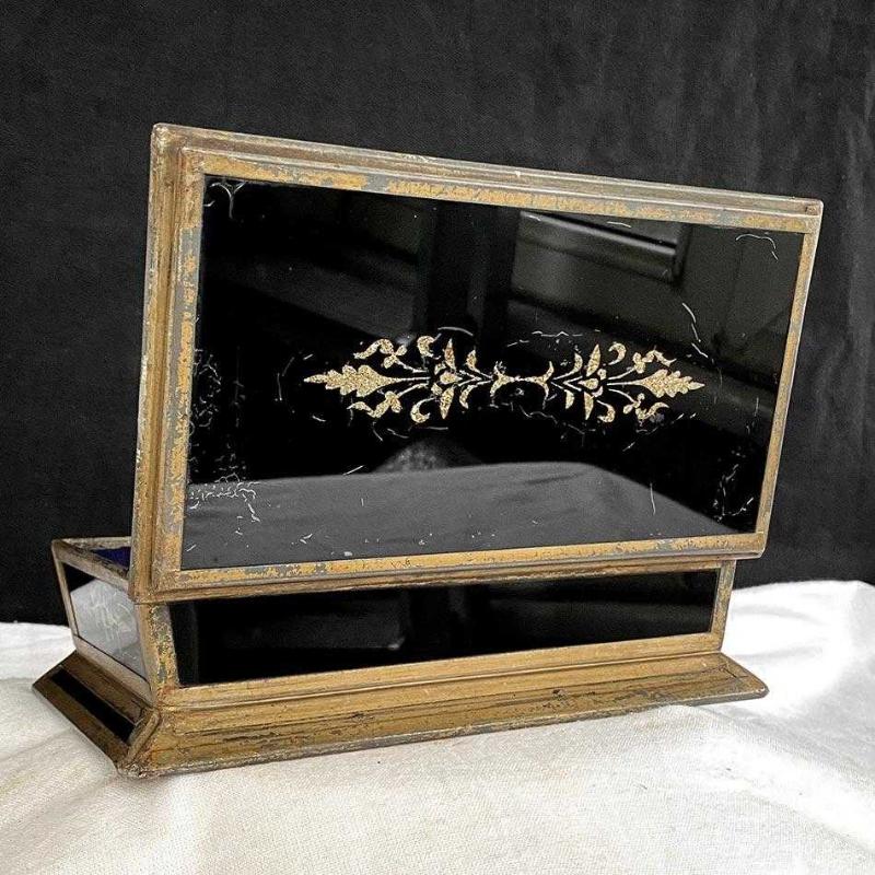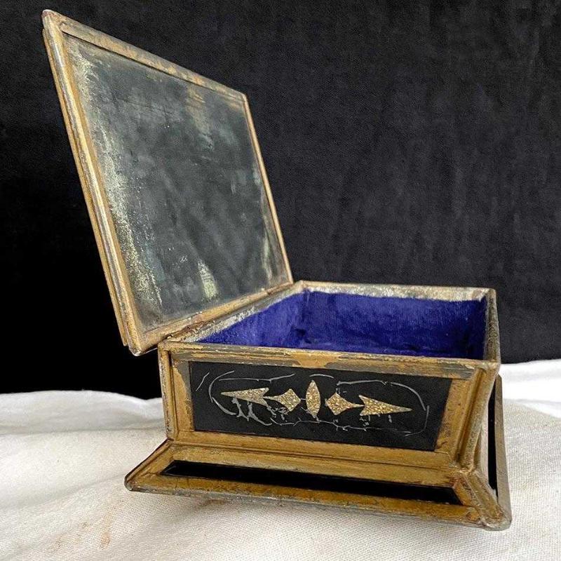 1960’lerin Avrupa zanaat mirasını taşıyan zarif kutu, metal gövde üzerine cam kaplama yüzeye sahip. Cam yüzeyin altında zarif desenler olan kutu, "cam altı" denen bir teknikle üretilmiş. Bu teknikte toz boya ile zemin üzerinde motifler oluşturuluyor, ardından motifin üzerine cam konulup sıkıştırılarak sabitleniyor. Böylece motif hiç bozulmuyor. Boyut ve Form: Kutu dikdörtgen yapıda, tabana doğru genişleyen kademeli bir forma sahip. Kapak ve Menteşe: Kapak, arkadan iki adet menteşe ile gövdeye bağlı ve cam altı plakası metal çerçeve içine kusursuzca oturtulmuş. Kapak Üstü: Siyah opalin camın alt yüzeyine, toz boya ve altın yaldız ile işlenmiş bitkisel ve simetrik geometrik motifler yer alıyor. Yan Paneller: Kutunun dört yan yüzeyinde, Art Deco esintili "ok ucu" (arrow) grafikler yine cam altı tekniğiyle uygulanmış. İç Tasarım: Kutunun iç kısmı, mücevher veya değerli evrakları korumak amacıyla orijinal lacivert kadife kumaş ile kaplı. Kutu yaşına göre iyi durumdadır. Kapak ve menteşelerinde, cam panellerde kırık veya çatlak yoktur. Metal çerçevelerdeki doğal altın sarısı aşınmalar dışında herhangi bir sorunu yoktur. 11x5x19 cm 500 gr