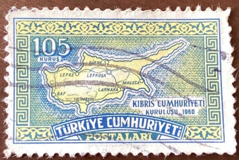 1960 yılında Kıbrıs Cumhuriyeti'nin kuruluşunu anmak için çıkarılmış 105 kuruş değerinde, kullanılmış bir Türkiye Cumhuriyeti posta puludur. Kıbrıs haritası üzerinde Girne, Lefkoşa, Mağusa, Larnaka ve Baf gibi önemli şehirler işaretlenmiştir. KONDÜSYONLARI RESİMLERDE GÖRÜLDÜĞÜ GİBİDİR.