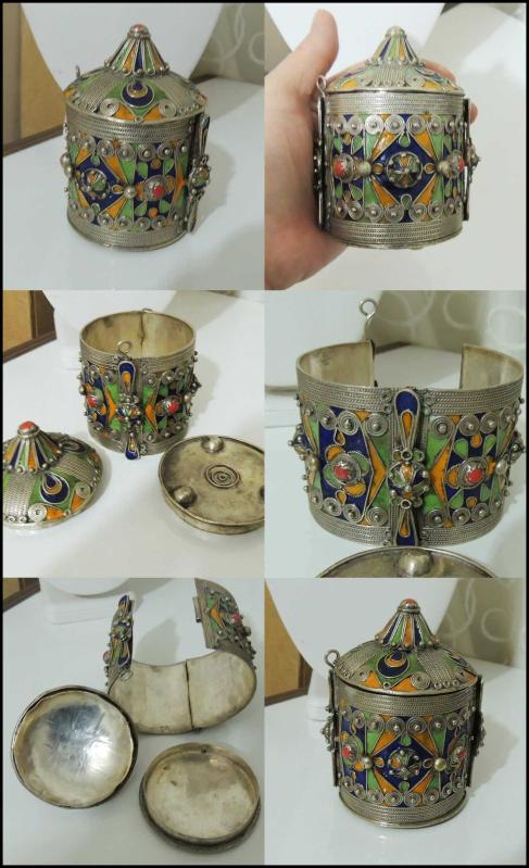 Yükseklik 100mm. Çap 69mm. Damga Yok. Metal gümüş rengi .Hem kutu hem bilezik olarak kullanılıyor.Çok değişik bir ürün ve büyük ihtimalle Cezayir yapımı.Üzerinde çok canlı renklerde mine ve cam olduğunu düşündüğümüz taşlar var. Çok iyi durumda.Lütfen resimleri dikkatlice inceleyiniz. 0027 *Ürünler %100 Orijinaldir.! *Yukarıda anlatımı yapılan ürünü satın almadan önce aklınıza takılan soruları hiç çekinmeden sorabilirsiniz.En kısa zamanda seve seve cevap veririz. *Sattığımız ürünlerin hepsi tarafımızdan garantilidir.Herhangi bir hasar veya kusur durumunda Kargo Görevlisine tutanak tutturarak İade etme garantisi vardır. *Hijyen nedeniyle İadesi yapılamayan ürünler şunlardır; ----Kozmetik ürünleri (Krem, losyon, parfüm, makyaj malzemeleri,vs) ----Mayolar ,İç Çamaşırları ve Giyim Eşyaları. *Kullanılmış, Vintage veya Antika olarak belirttiğimiz ürünler hiçbir zaman SIFIR ürün kondisyonunda değildir ve olmaları da beklenemez. Bu tip ürünlerin kondisyon detayı tarafımızdan ayrıntılı olarak verilecek ve mümkün olduğunca çok resimlenecektir. *Patinasını kaybetmemesi için hiçbir antika ürünü temizlemiyoruz. *Alıcılar bizden ürün alırken bu şartları kabul etmiş demektir.! HAPPY BIDDING...! İYİ ALIŞVERİŞLER!!!