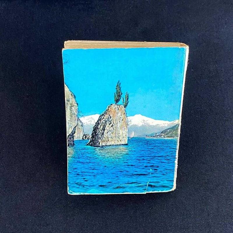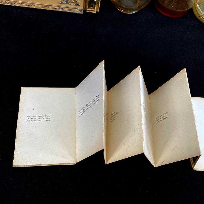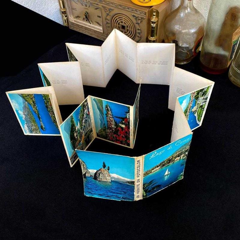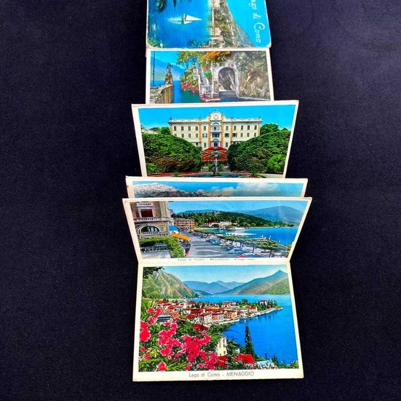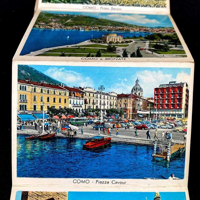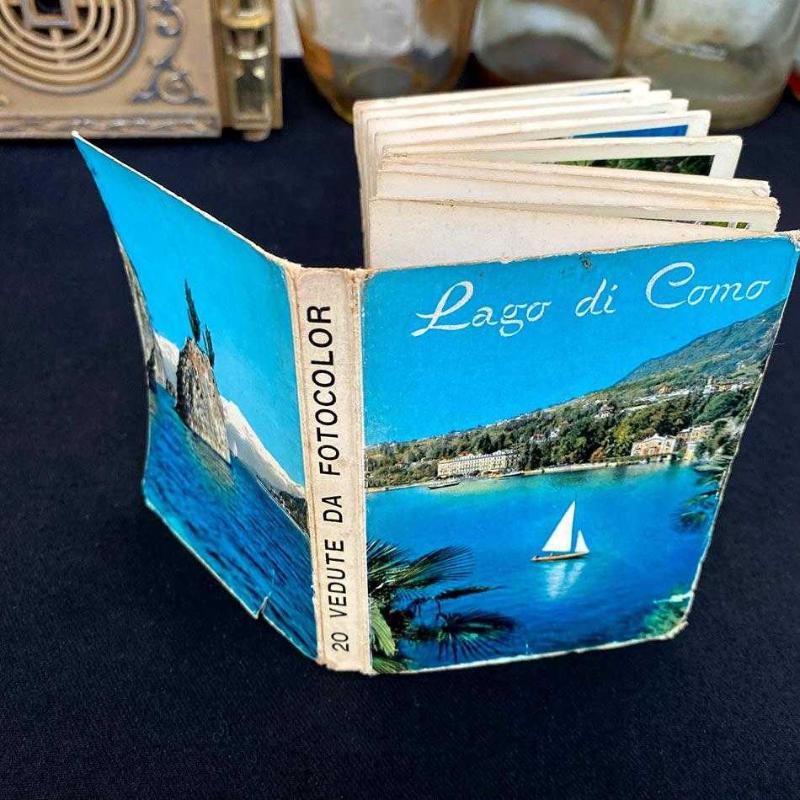 Avrupa sosyetesinin uğrak yeri meşhur İtalyan Como gölünün 1960'lardan kalma tanıtım kartpostal kitapçığı. Kitapçığın sırt kısmında "20 vedute da fotocolor - Renkli fotoğraflardan oluşan 20 manzara" yazılı. Açılır katlanır şekilde basılmış 20 adet resmin arka yüzünde 3 dilde lokasyon bilgileri yer alıyor. Çok iyi durumdadır, özenle saklanmış, herhangi bir yırtık, eksi sayfa yoktur. 11x8 cm 60 gr