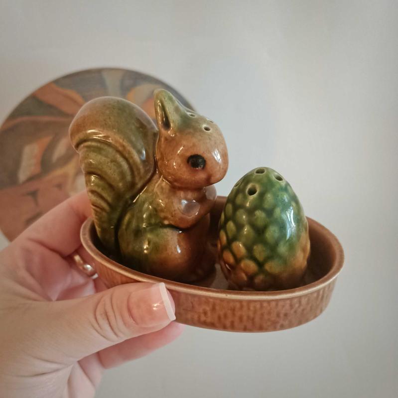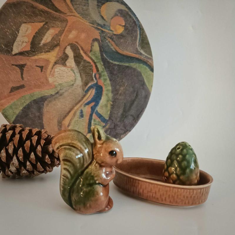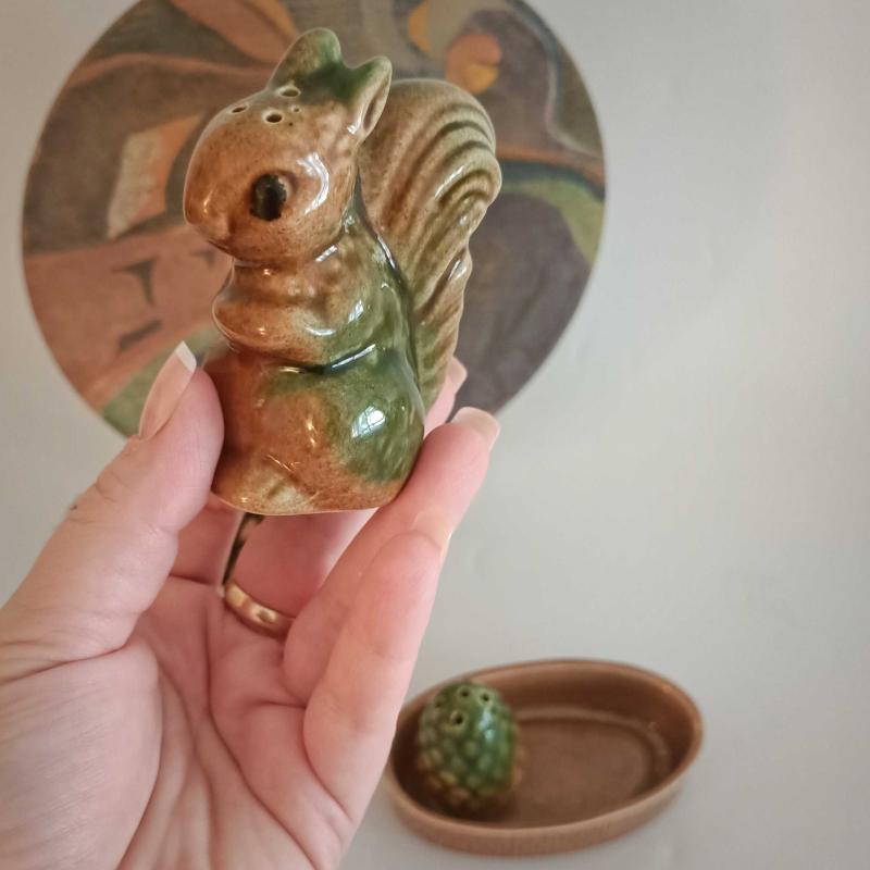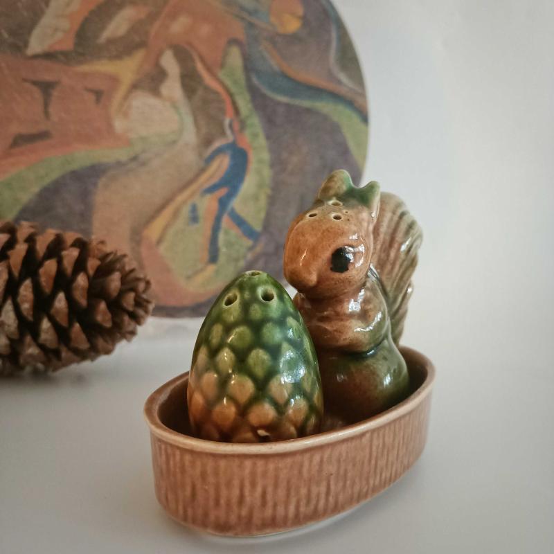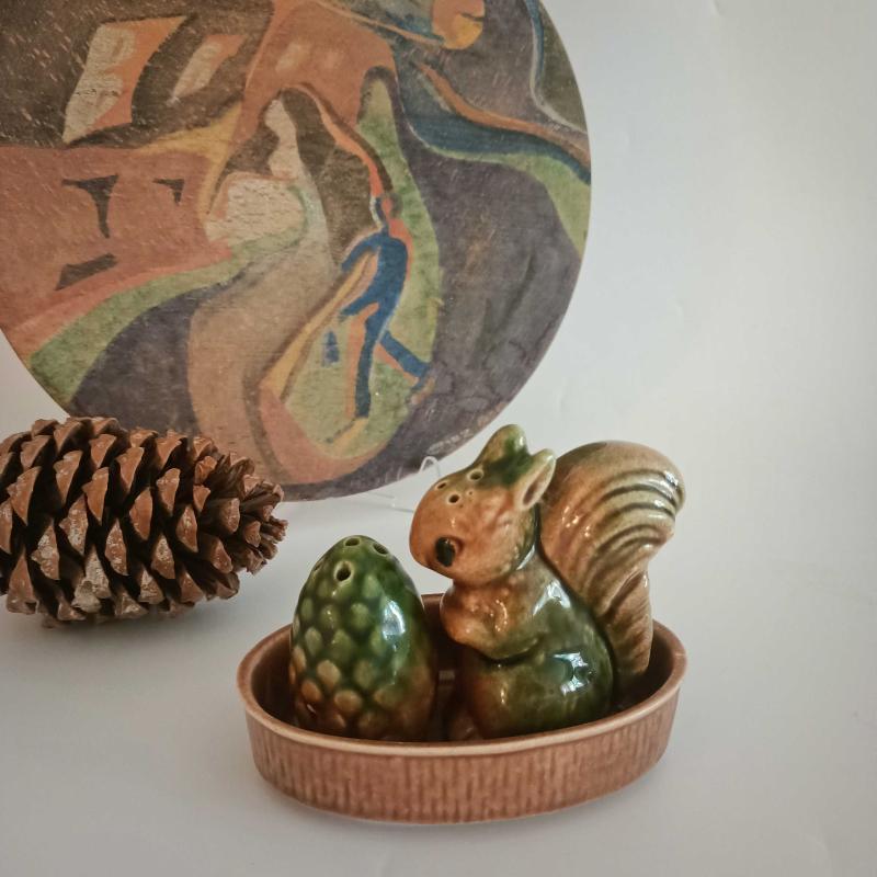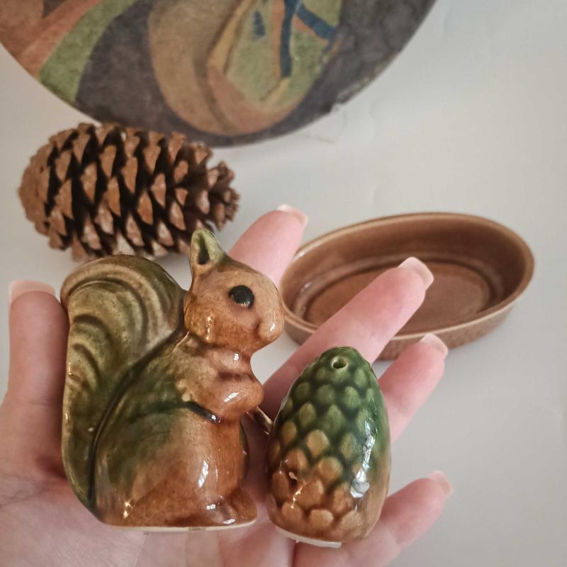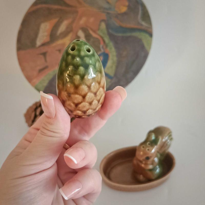 Doğanın sıcak tonlarını sofranıza taşıyan, 1960’lardan kalma son derece nadir bir parça. El yapımı seramik formunda sincap ve kozalak figürleriyle dönemin rustik estetiğini mükemmel biçimde yansıtıyor. Kusursuza yakın kondisyonda; yalnızca orijinal tıpalarından kaynaklı çok hafif bir dengesizlik mevcut — dönemine özgü detaylarıyla tamamen orijinal. Bu ikili, koleksiyonluk bir obje olarak da, sıcak bir mutfak rafında ya da rustik bir sofrada dekoratif detay olarak da büyüleyici durur. -1960’lar üretimi, seramik -Muhtemelen Batı Almanya kökenli -Eşine az rastlanır, koleksiyon değeri yüksek vintage bir parça Not: Tüm ürünlerimiz gibi bu parça da geçmiş yıllardan özenle seçilmiş, vintage bir objedir; dolayısıyla çok ufak yaş izleri taşıyabilir — bu da her birinin hikayesinin bir parçasıdır.