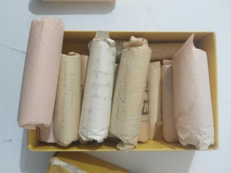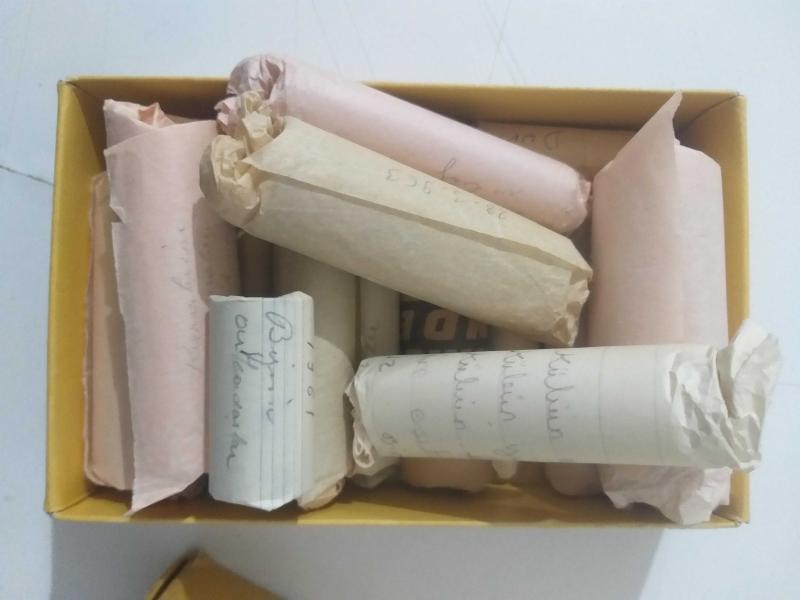 KAĞITLARA RULO YAPLARAK SAKLANMIŞ. RULOLARIN ÜZERİ NOTLU AMA OKUYAMADIK. KARTON KUTUDA LEKELER VE DEFORMELER VAR GALİBA BİR AİLEYE AİT.