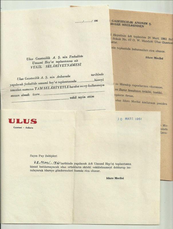 ** 1961 ANKARA ULUS GAZETESİ ** 10 Mart 1964 tarihli Umumi Hey'et toplantısı bildirisi, henüz doldurulmamış Vekil Selahiyetnamesi ve gündemin yazılı olduğu bir programın bulunduğu 3 parçalık bir efemera grubudur...