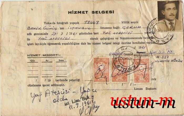 ** ÇORUH GEMİSİ YAĞ ATEŞÇİSİ HİZMET BELGESİ ** Yarım A4 ebadında,arka yüzüde yazılı ve imzalı resmi evrak türünde,fotoğraflı,temiz durumda, Çoruh Gemisi'nde yağ ateşçisi olarak çalışan Bekir Gümüş'ün,3 adet damga pullu,1961 tarihli hizmet belgesidir...