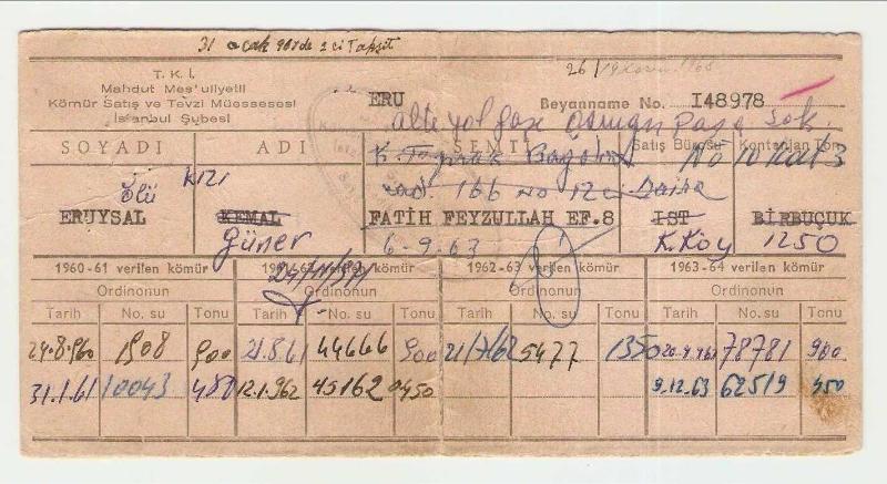 ** 1960-1961 KÖMÜR SATIŞ VE TEVZİ MÜESSESESİ ** 17.3 x 8.7 cm.ebadında,önlü arkalı görüntülenmiş,gayet temiz durumda eski kömür karnesidir...