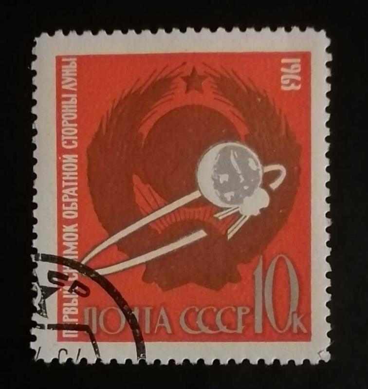 Uzay temalı. "Luna 3" uzay aracının Ay'ın karanlık yüzünü fotoğraflamasının anısına basılmış seriden bir parça. Sol taraftaki Kiril alfabesiyle yazılmış metin kabaca "Ay'ın öteki yüzünün ilk fotoğrafı" anlamına gelir.