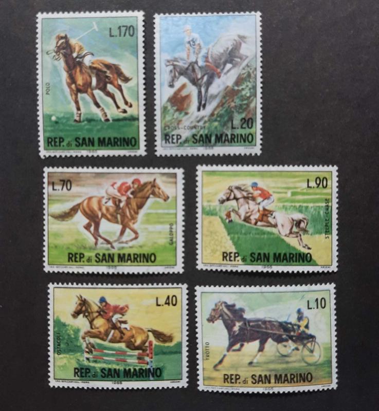 Bu görüntüdeki koleksiyon parçası, 1966 yılında San Marino tarafından çıkarılan, binicilik sporlarını (at yarışları) konu alan 6 pulluk eksiksiz bir settir. Özellikleri: Pullar, "Nane" (Mint Never Hinged) kondisyonundadır, yani orijinal sakızı bozulmamıştır ve hiç kullanılmamıştır. Temalar: Set, polo, atlama (steeple-chase), tırıs (trotto) ve genel galop yarışları dahil olmak üzere çeşitli binicilik disiplinlerini içerir. Değerler: Pulların üzerinde farklı Lira (L.) değerleri bulunur (örneğin: L.10, L.20, L.40, L.70, L.90, L.170).