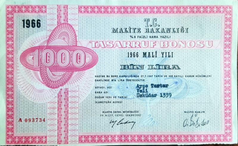 1966 Senesi Maliye Bakanlığı TASARRUF BONOSU - BİN LİRA, 28 gün önce satışa sunulmuştur.