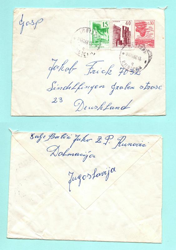 Posta tarihi koleksiyonerleri dikkatine, Yugoslavya da belirli bir posta tarifesini karşılamak için çeşitli pulların kullanıldığı, gerçek posta dolaşımı görmüş filatelik zarflar. 1. zarf üç pullu ve üzerinde iki adet dairesel posta damgası bulunmaktadır. 1966 yılında Almanya ya postalanmıştır. 2. Zarf üç pullu ve üzerinde iki adet dairesel posta damgası bulunmaktadır. 1967 yılında Almanya ya postalanmıştır.