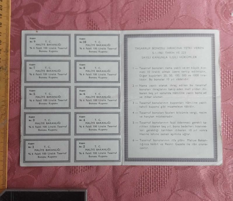 1967 T.C. Maliye Bakanlığı Tasarruf Bonosu Seti 100 TL, Tam Kuponlu) 1967 tarihli, T.C. Maliye Bakanlığı tarafından ihraç edilen orijinal Tasarruf Bonosu Koleksiyon değeri yüksek, nadir bir dönem belgesidir. Nominal değer:100 TL Kondisyon: Çok iyi (yırtıksız, lekesiz, tam kuponlu) Tam kuponlu 100 Liralık kuponlar nadirdir.
