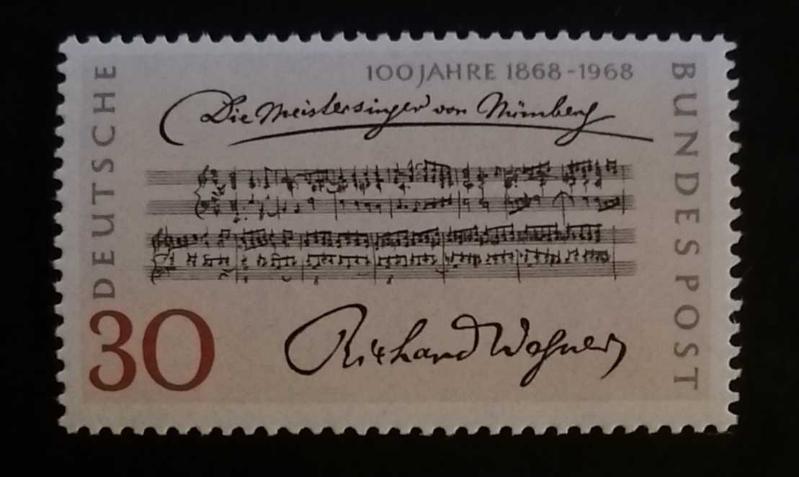 Bu, Richard Wagner'in "Die Meistersinger von Nürnberg" (Nürnbergli Usta Şarkıcılar) operasının açılış notalarını ve bestecinin imzasını içeren bir Alman posta puludur. Pul, 1968 yılında Alman Federal Postası (Deutsche Bundespost) tarafından basılmıştır. Ekonomik Değer: Damgasız ve çok temiz (MNH) kondisyonda yaklaşık 15 TL - 25 TL arasındadır.