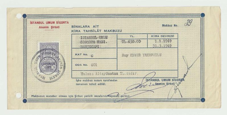 1969 İSTANBUL UMUM SİGORTA KİRA TAHSİLAT MAKBUZU...
