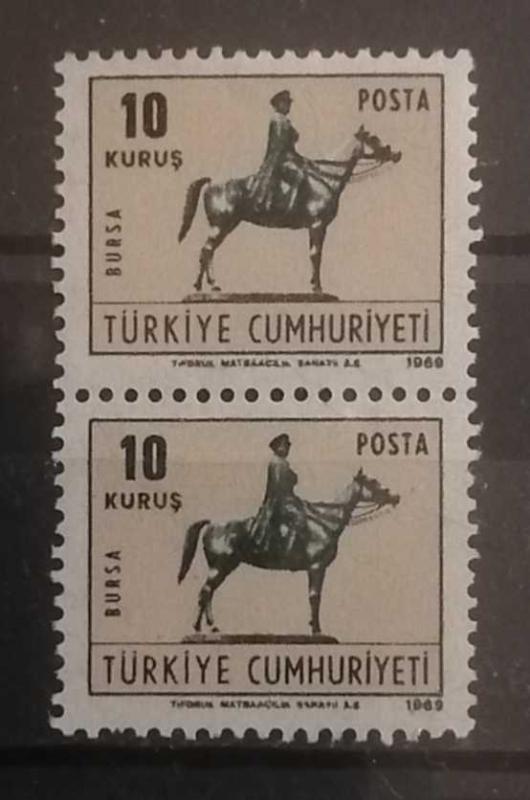 Görseldeki bu pullar, Türkiye'nin "Atatürk Anıtları" (veya bazen Şehirler serisi olarak da adlandırılır) serisine ait Bursa Atatürk Anıtı temalı pullardır. Ancak bu şekilde temiz bir ikili grup, kondisyonuna göre yaklaşık 30 TL ile 60 TL bandında bir değere sahip olabilir.