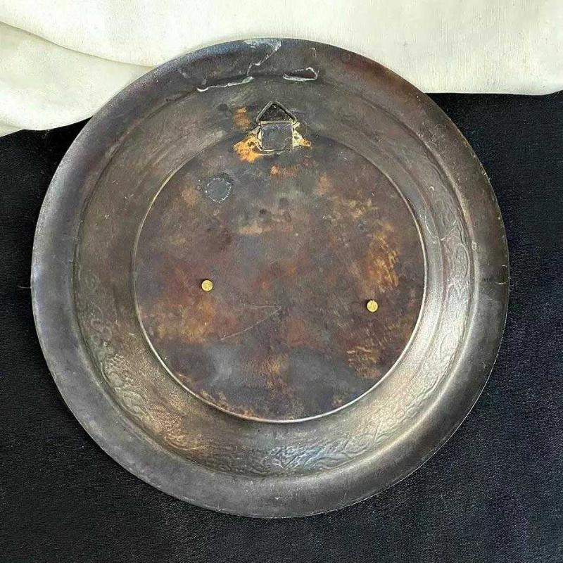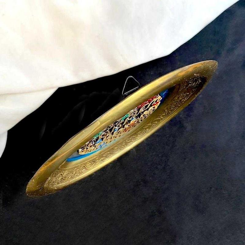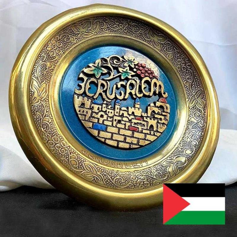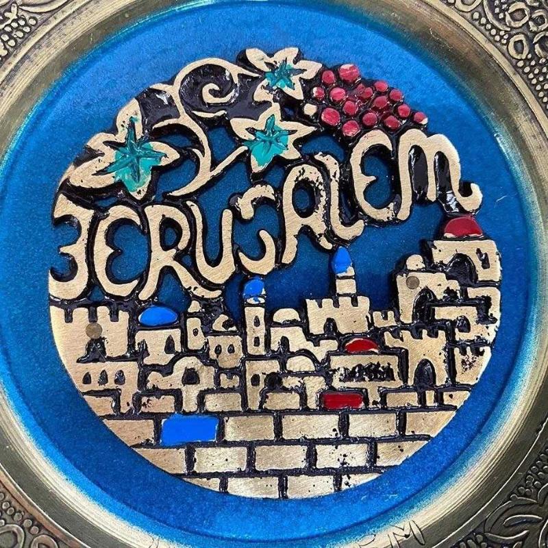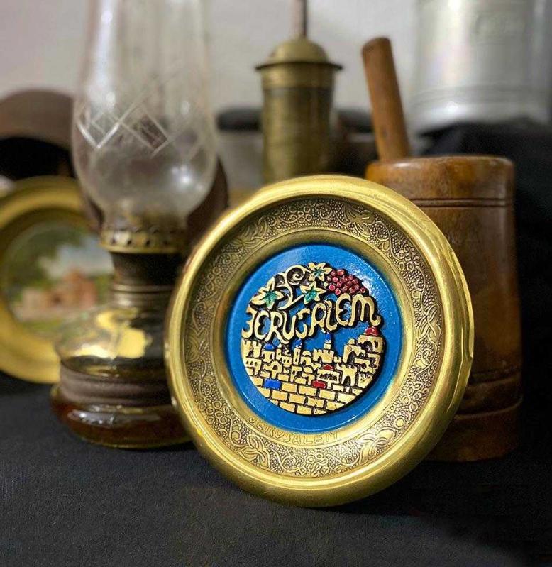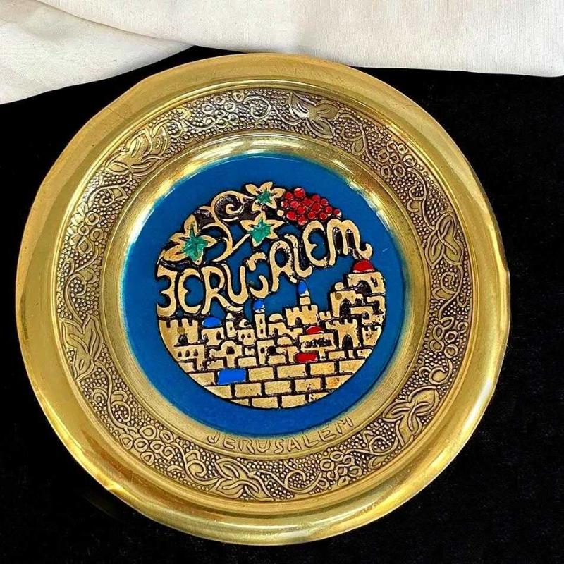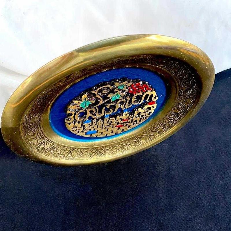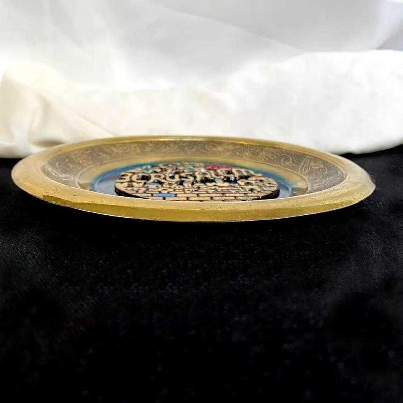 1970'lerden dövme bakırdan el işçiliğiyle üretilmiş harika bir dekoratif tabak. Tabağın çevresinde, detaylı bir kalem işçiliğiyle zarifçe işlenmiş, üzüm ve asma yaprakları deseni yer alıyor. Tabağın ortasında, yine üzüm ve asma yaprağı ile Kudüs şehir duvarları ve Jerusalem-Kudüs yazısı yer alıyor. Çok güzel, renkli bir rüstik dekorluk aksesuar olan tabak, dini obje sevenler ve koleksiyonerler için nadir bir üründür. Tabak iyi korunmuş, yaşına göre genel olarak iyi durumda. Kenarlarında hafif yamukluklar var, herhangi bir kırık, çatlak yoktur. Çap: 15 cm 100 g