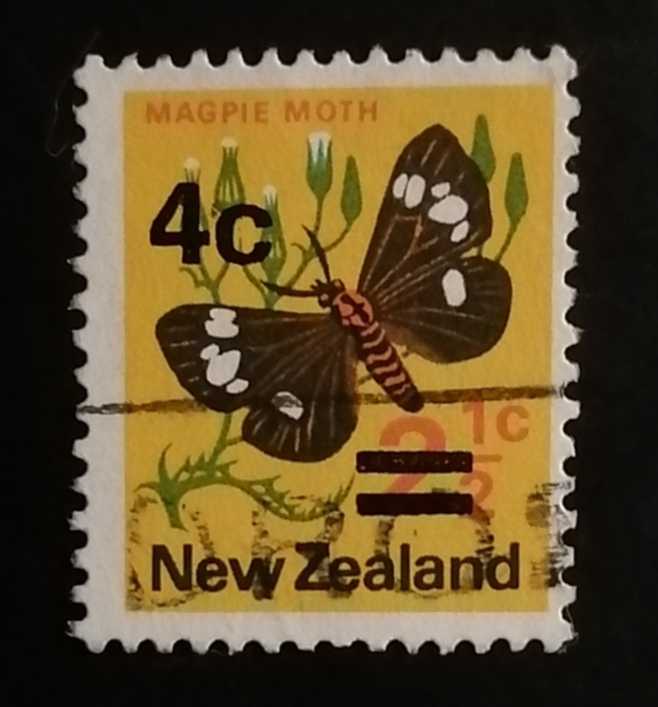 1971 yılında posta ücretlerindeki değişiklik nedeniyle, eski pulların üzerine matbaada siyah bir çizgi ve büyük bir "4c" ibaresi basılarak değeri güncellenmiştir. Görsel: Pulun üzerinde Yeni Zelanda'ya özgü bir tür olan "Magpie Moth" (Saksağan Güvesi) yer alır.