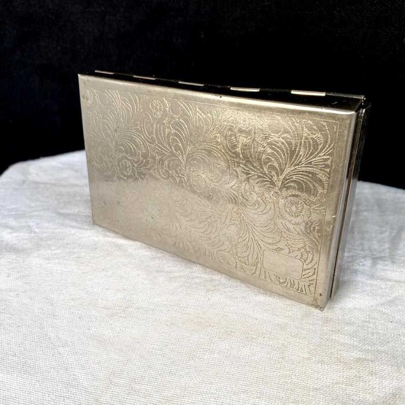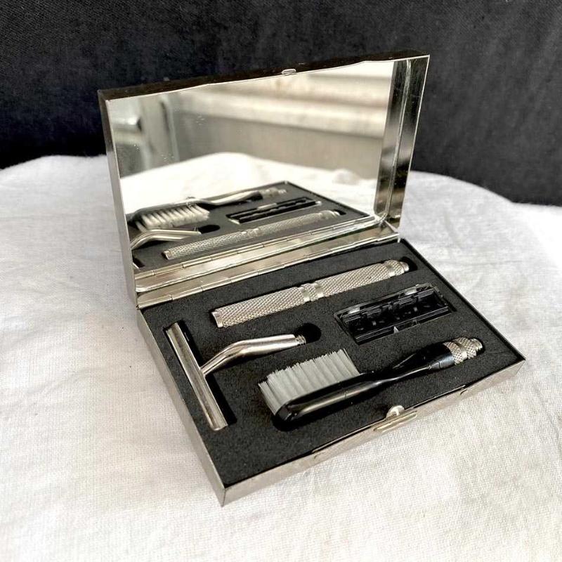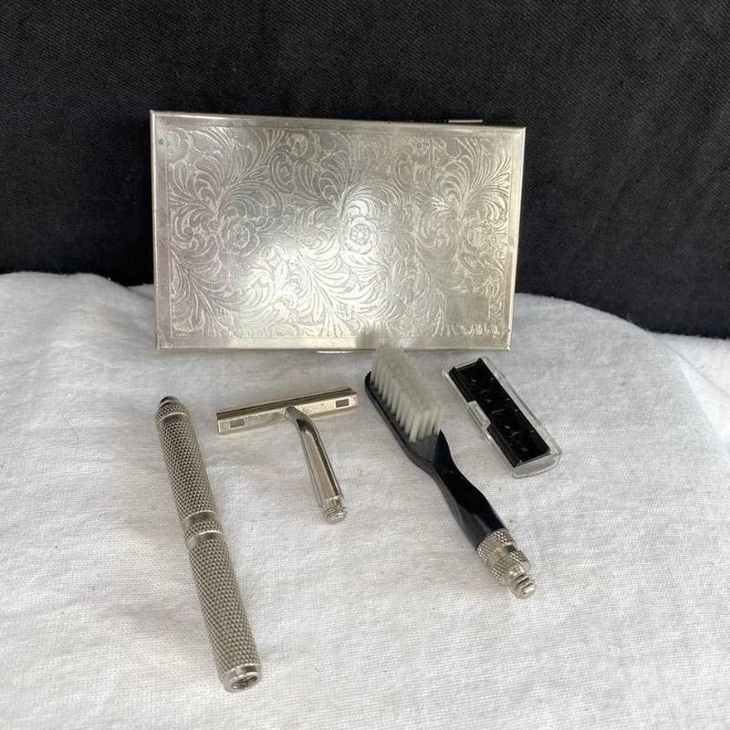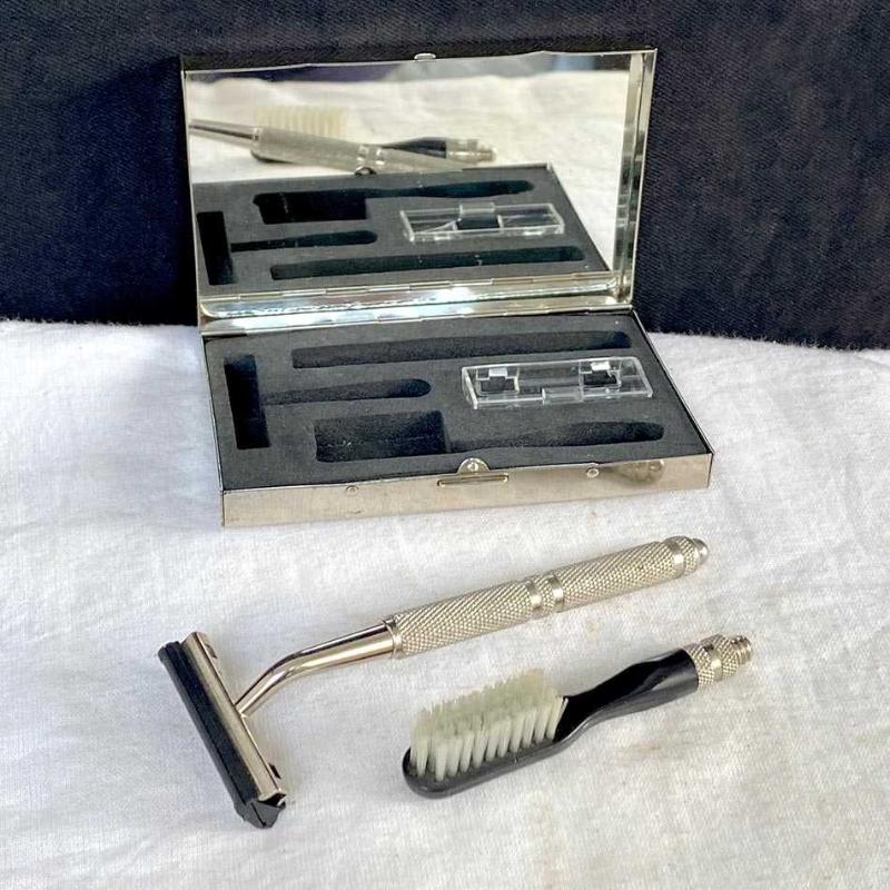 Nikel kaplama ağır pirinç döküm kutusunda 1970'lerden şık bir tıraş seti. Kutunun iç kapağına monte edilmiş cam bir ayna bulunuyor. Kutuda, nikel kaplama pirinç sap ve sapa takılabilen diş fırçası ve tıraş aleti ile bir adet çift bıçaklı jilet başlığı bulunuyor. Kutunun arka yüzünde, alt köşede bu tür üst kesime hitap eden, şık seyahat setleri üreten "trio" markasının logosu basılmış. Set hiç kullanılmamış ve yaşına göre iyi durumdadır. Ağır metal kutunun bazı yerlerinde ufak aşınma ve göçükler dışında sette ksik ya da kırık bir parça yoktur. Kutu: 7x11x2 cm 200 gr